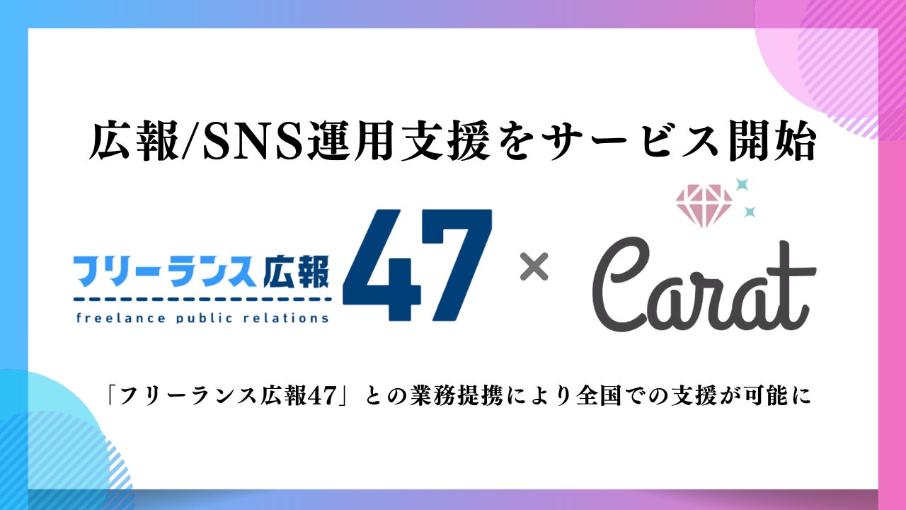 Carat株式会社(本社:東京都渋谷区、代表取締役社長:中屋まり、以下「Carat」)は、このたびフリーランス広報のためのオンラインコミュニティ「フリーランス広報47」(株式会社アイコとバ 代表取締役CEO:冨松愛子、以下「フリーランス広報47」)と業務提携をし、広報/SNS運用支援のサービスを開始しました。当社の得意領域である、ブランディング・採用支援(RPO)・人事コンサルティングとともに広報活動(SNS運用含む)にも幅広くご支援が可能となります。特に、企業の皆様からもニーズの高い、人事・採用・広報・SNS課題に対して、柔軟性かつハンズオンの体制にて対応していきます。