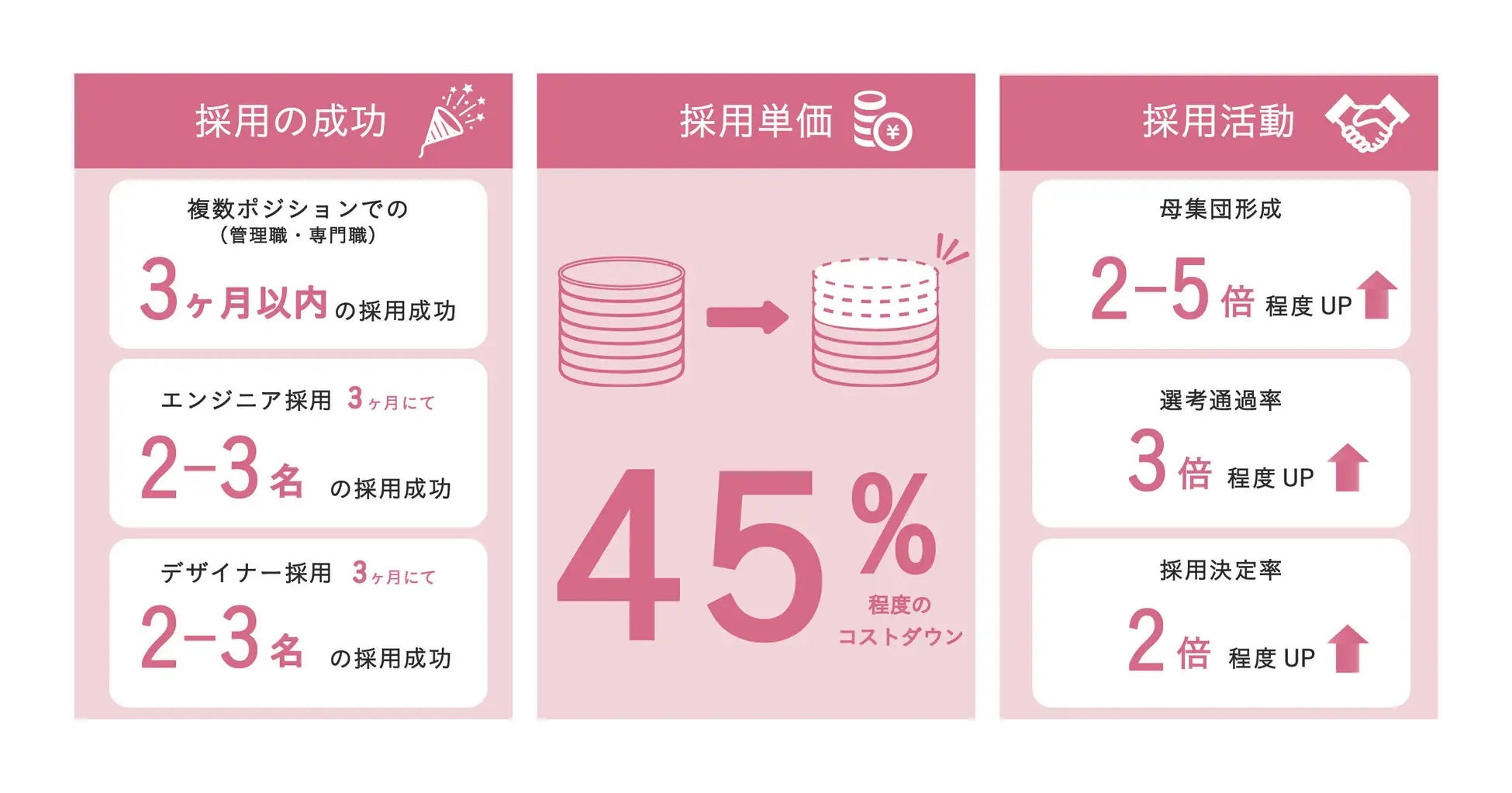 最大45%の採用単価削減、3カ月以内に複数ポジションの採用の成功、および母集団形成の最大5倍の向上など、採用戦略・採用広報活動・人事戦略において様々な成果を実現しています。