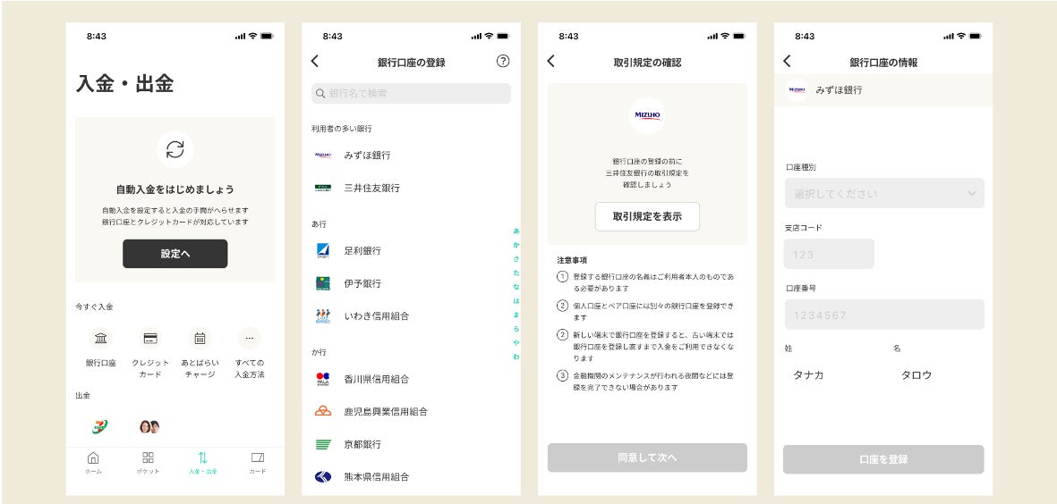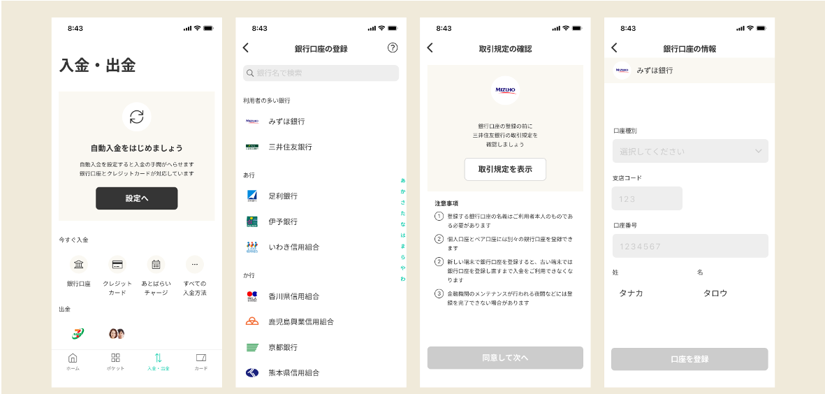 B/43(ビーヨンサン)では、期間や金額をあらかじめ設定し、銀行口座から定期的に入金できる「定期入金機能」などの新機能開発を予定しております。