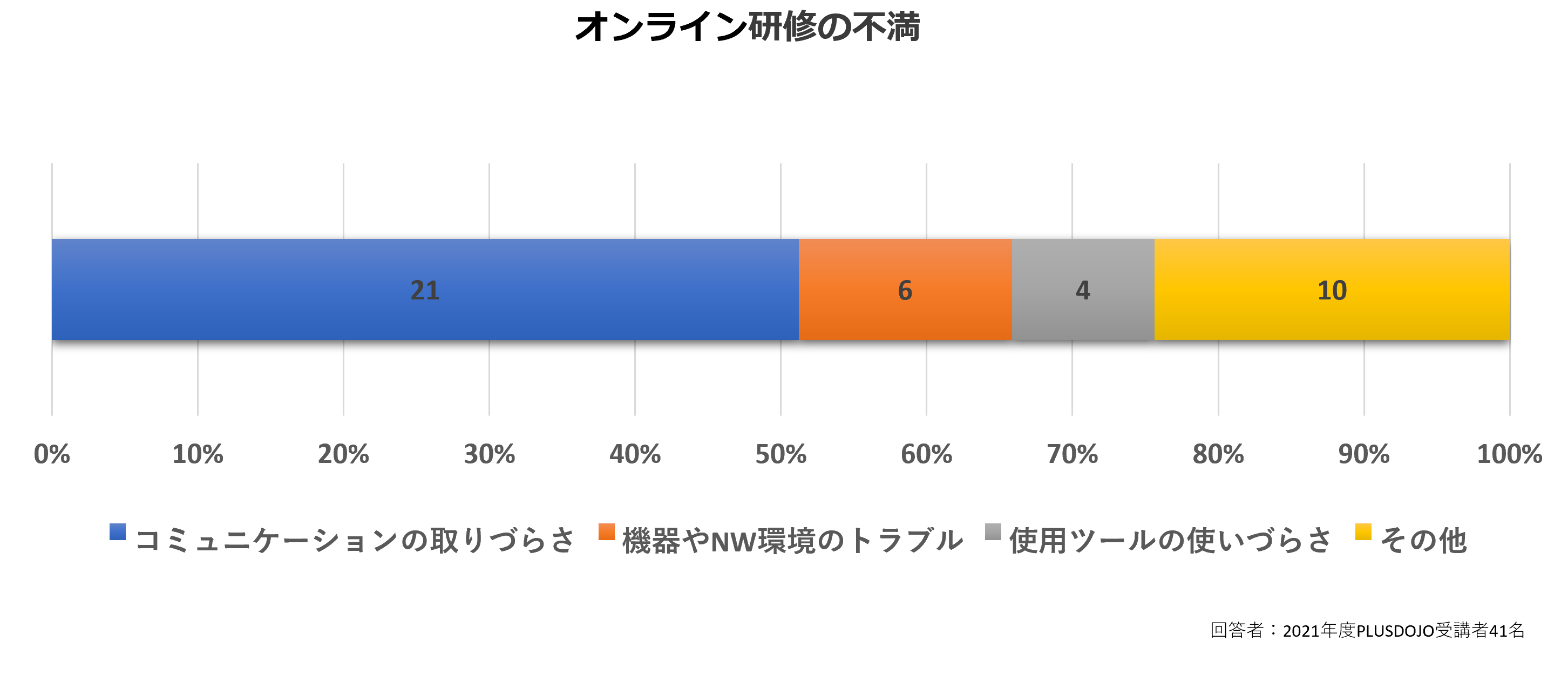 実際に2021年度のPLUS DOJO受講者へ行ったアンケート調査では、51.2%の受講者がオンライン研修の不満として、コミュニケーションの取りづらさを挙げていました。