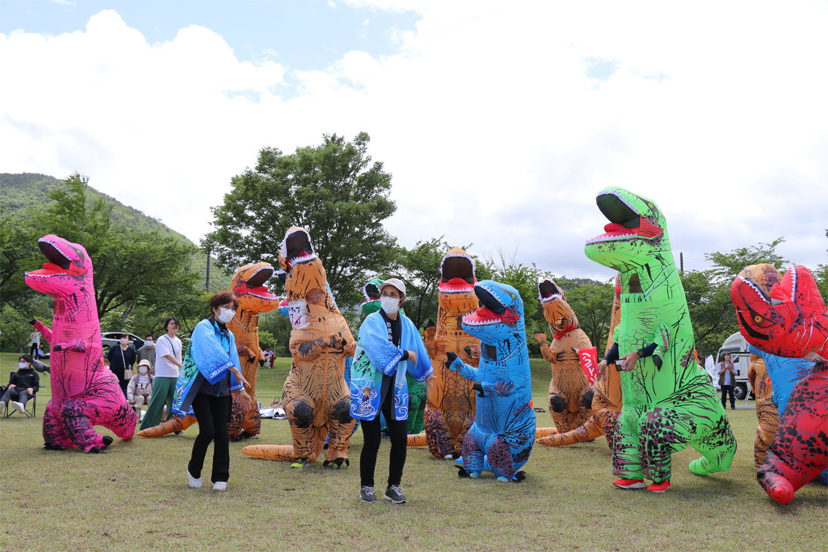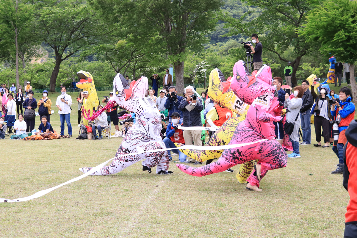 6月3日(土)に七ヶ宿ダム自然休養公園の運動広場で宮城県初のティラノサウルスレースが開催されました。県内外から110名の方が参加し、恐竜の着ぐるみを来て風の強い中「成獣オス」「成獣メス」「幼獣」に分かれて爆走しました。
