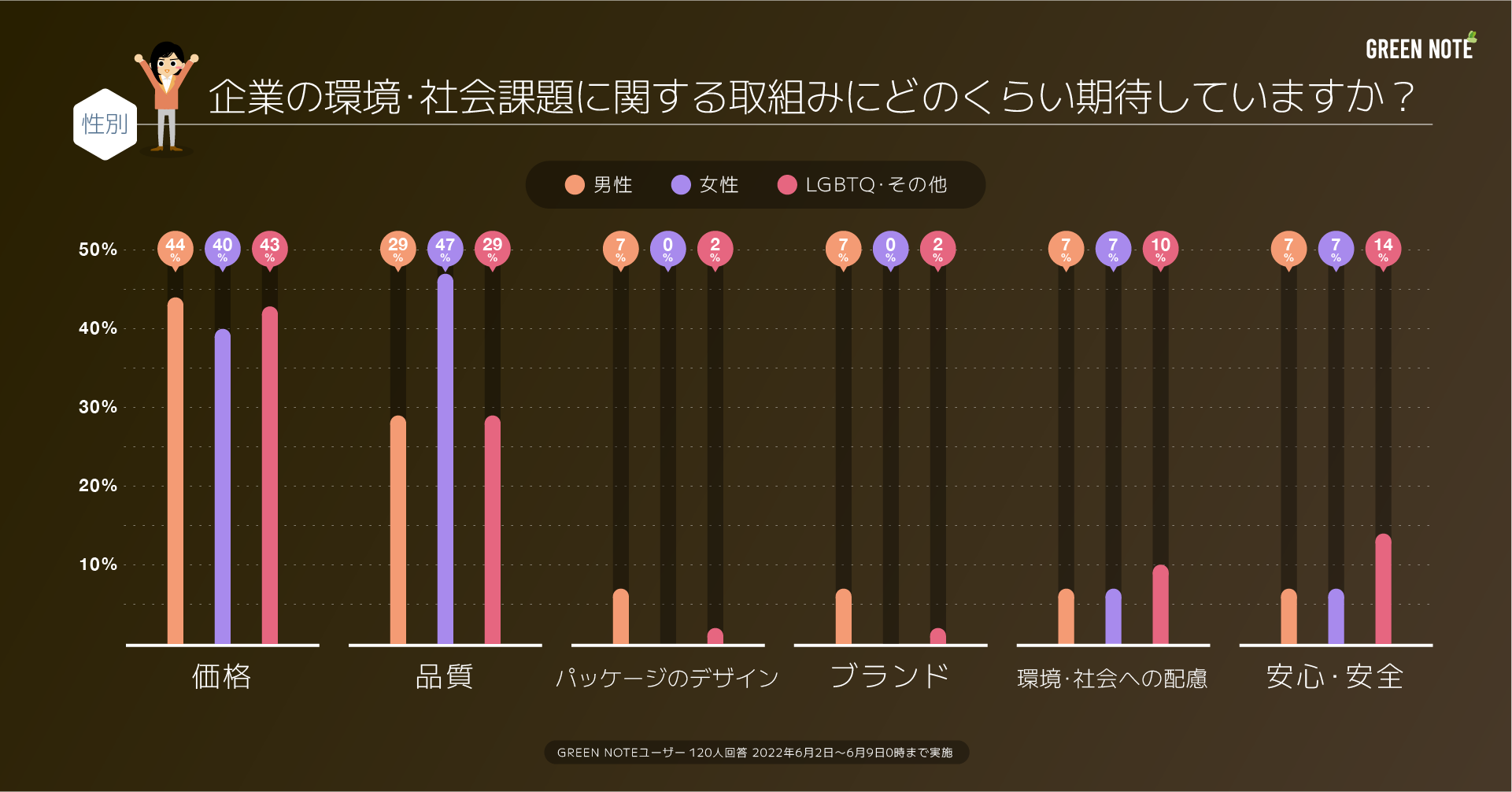 Greenroom株式会社(本社:東京都新宿区、代表取締役:山崎 修平)が運営するサステナビリティ / SDGs専門ニュースアプリ『GREEN NOTE(グリーンノート)』は、SDGsやサステナブルに関する意識を明らかにすることを目的に、サステナビリティに感度の高いアプリユーザー20~50代以上の120名を対象に「日用品について最も重視していること」に関する市場調査を実施。