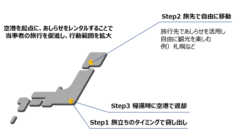 靴の中に挿入するデバイスにより、音声ではなく振動で情報を伝えるナビゲーション「あしらせ」を旅行や出張時に手軽に公共交通機関の窓口で借りて充実した旅・移動ができる仕組みを作っていきます。一方で、導入においては、受付における担当者の作業コストや、ビジネスモデルの構築など、様々な課題が存在しており本実証では上記課題に対するPOCを行い社会実装に向けて取り組みを加速させていきます。