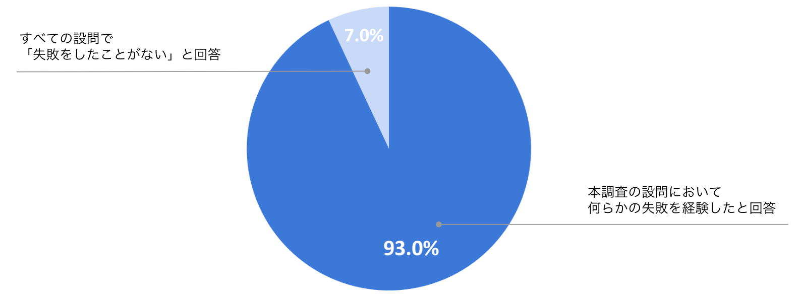 93%の回答者が何らかの失敗を経験しており、全ての質問において「失敗をしたことがない」と回答した人は7%に収まっています。