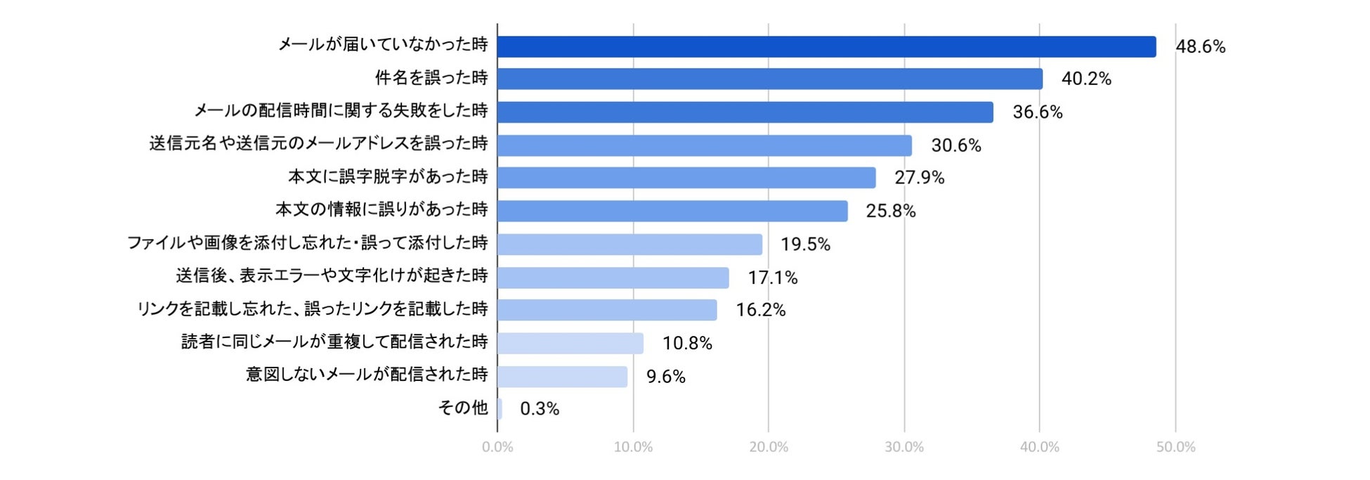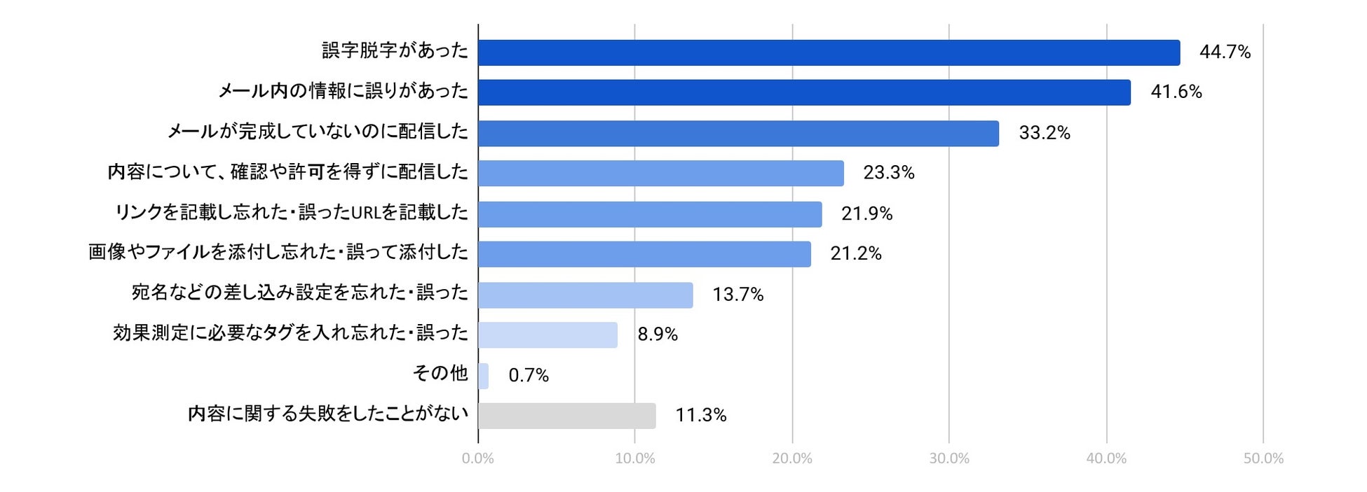 1位は「誤字脱字があった」(44.7%)、2位は「メール内の情報に誤りがあった」(41.6%)、3位は「メールが完成していないのに配信した」(33.2%)となりました。