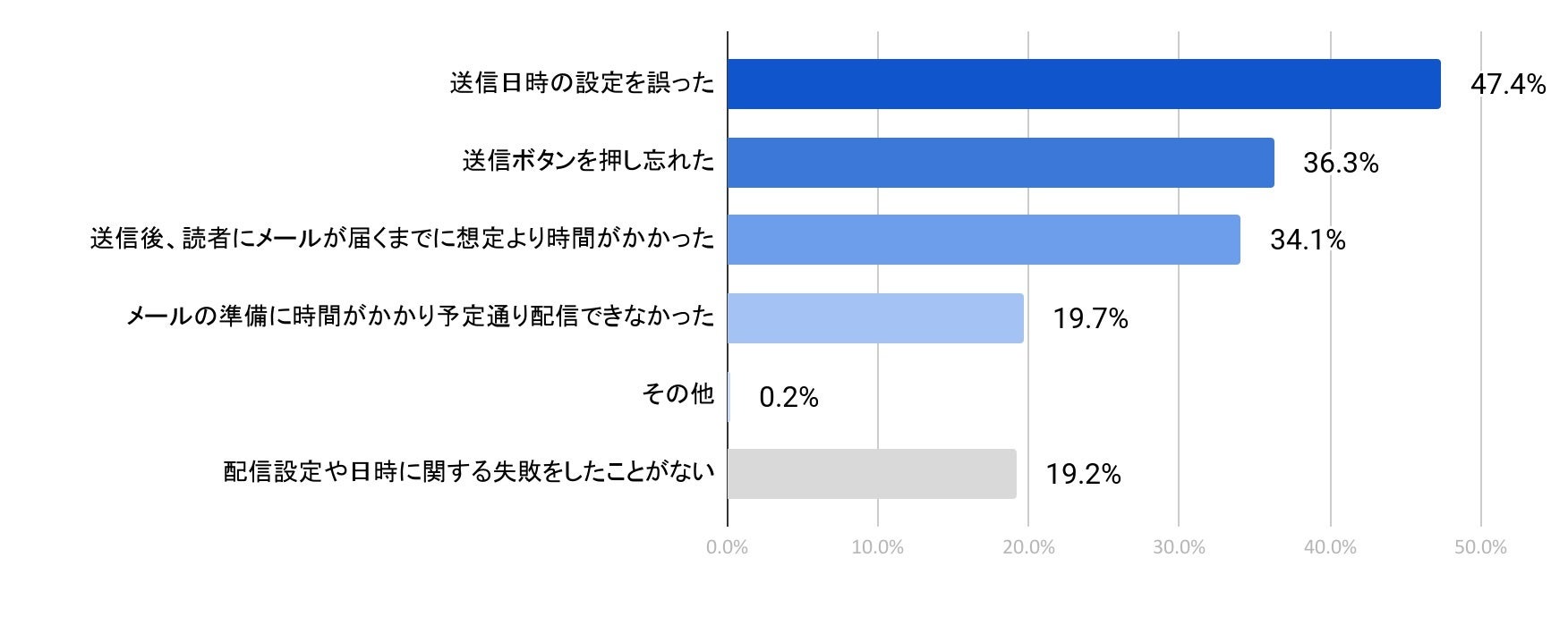 「送信日時の設定を誤った」が最も多く47.4%、続いて「送信ボタンを押し忘れた」(36.3%)が2位となり、人為的ミスが上位に入りました。