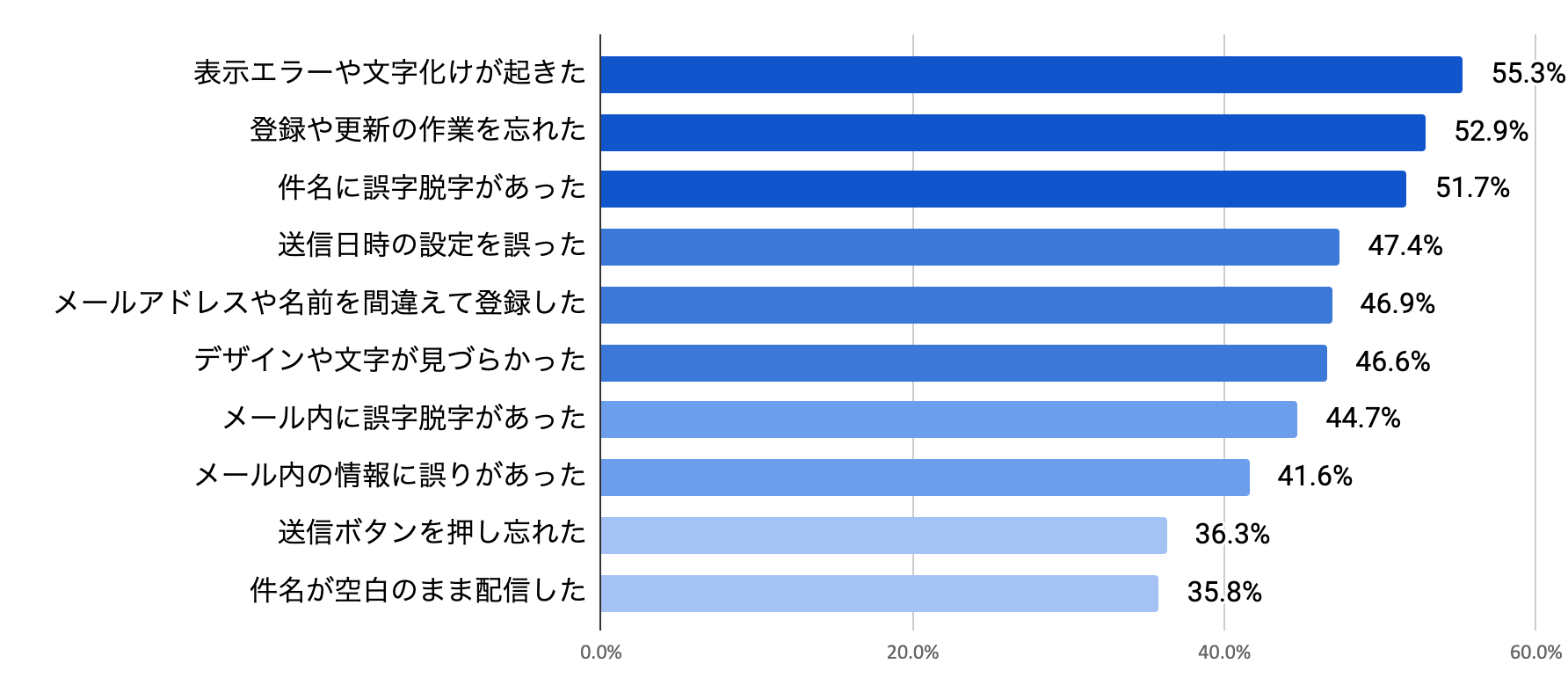 1位は「表示エラーや文字化けが起きた」(55.3%)、2位は宛先の「登録や更新の作業を忘れた」(52.9%)、3位は「件名に誤字脱字があった」(51.7%)でした。