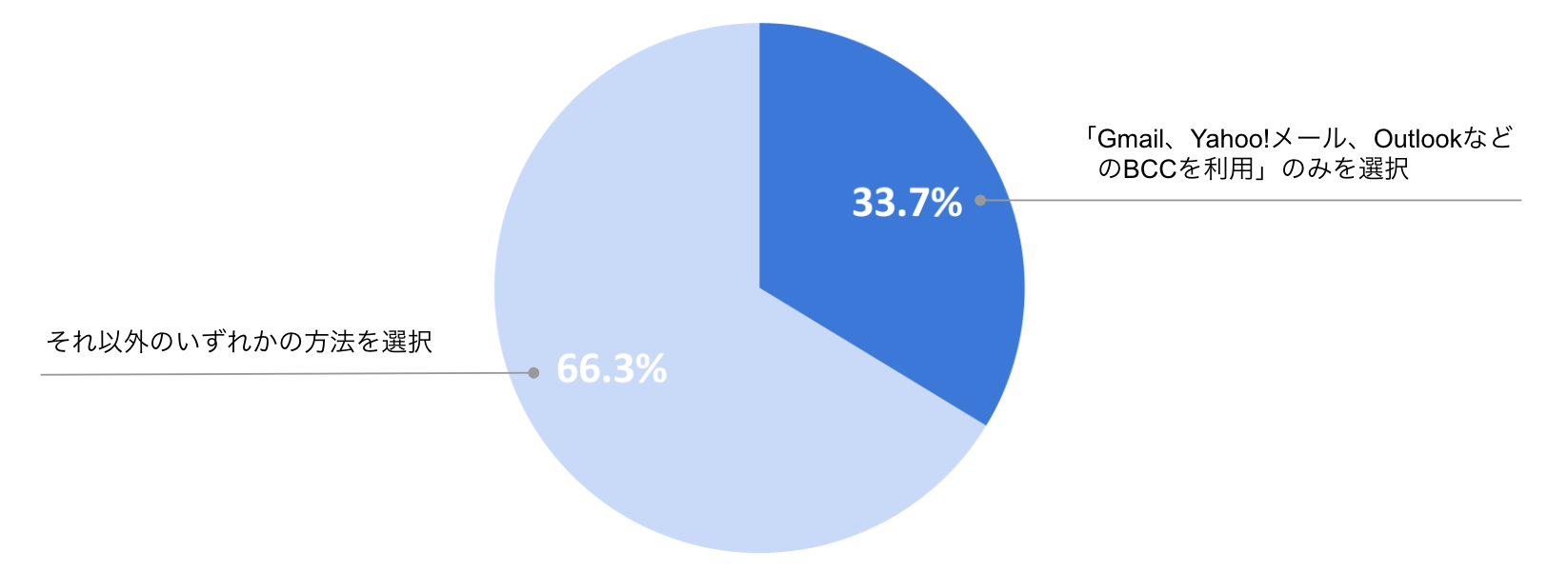 また、回答者の中で「BCC機能による一斉配信のみ利用したことのある人」は全体の33.7%、それ以外の方法を利用したことのある回答者は全体の66.3%でした。