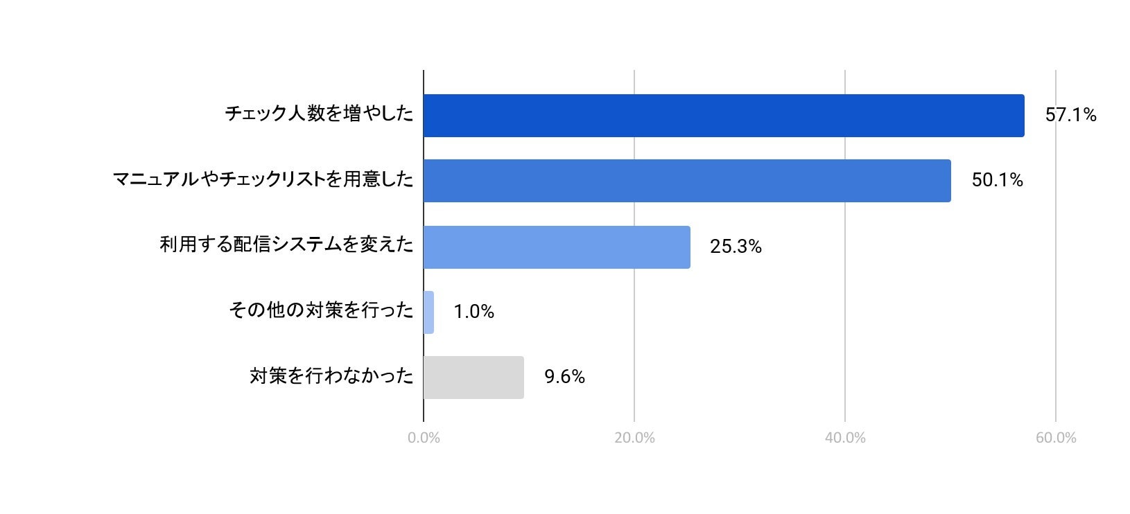 1番多かった回答は「チェック人数を増やした」(57.1%)、2位は「マニュアルやチェックリストを用意した」(50.1%)でした。