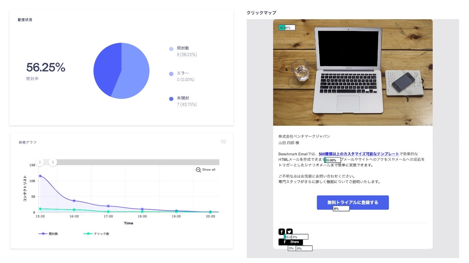 Benchmark Emailにも、開封率・クリック率などがリアルタイムで確認できるレポート機能のほか、何時に最も読まれているかが確認できる時間グラフ、メール上のどのリンクがクリックされたかがわかるクリックマップなど、効果改善に便利な機能が備わっています。