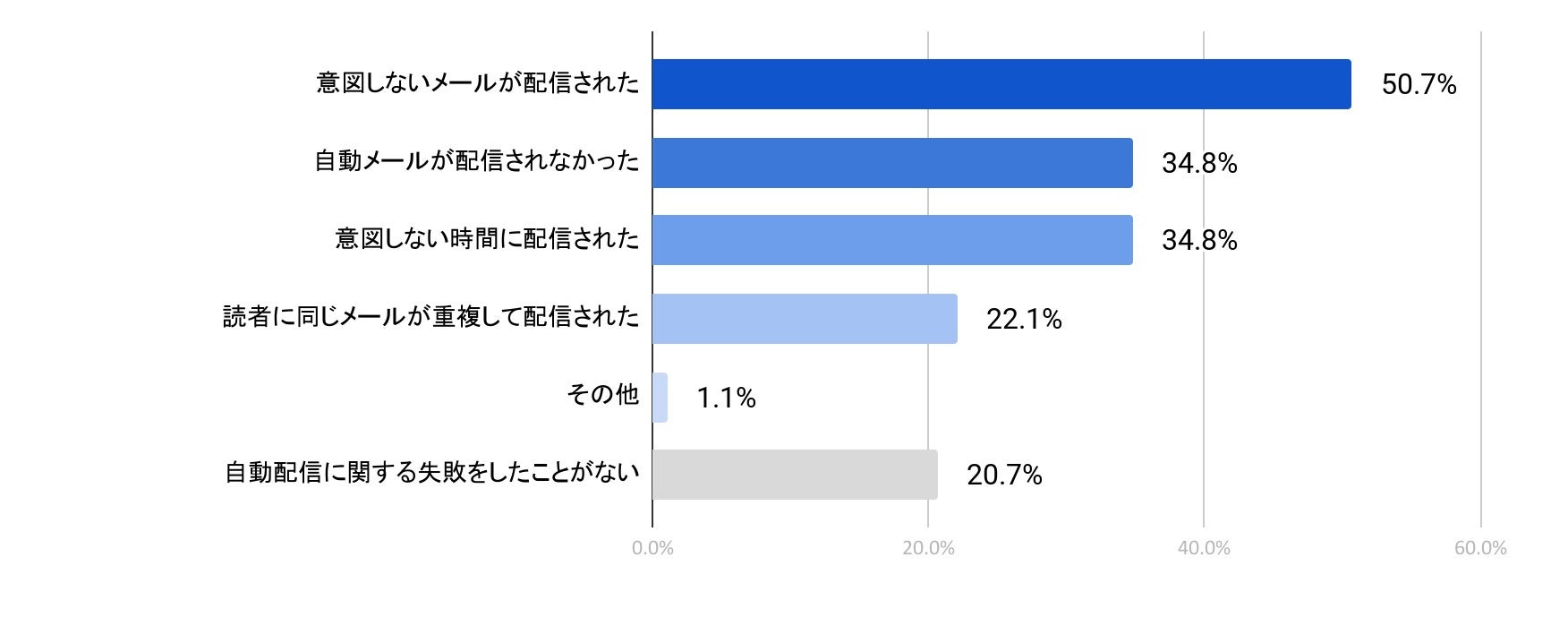 1位は「意図しないメールが配信された」(50.7%)となり、続いて「自動メールが配信されなかった」と「意図しない時間に配信された」の2つが同率(34.8%)で2位となりました。
