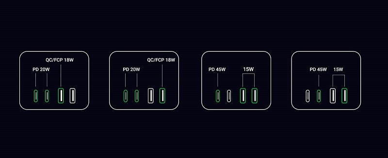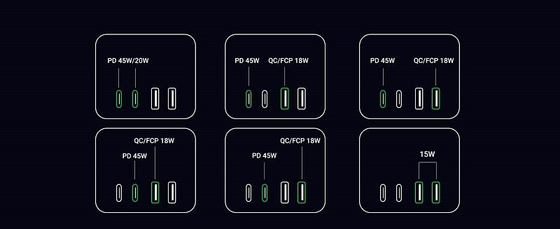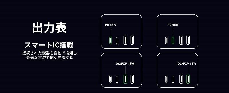 | USB出力 | 単ポート出力: USB-C1/C2:5V/3A 9V/3A 12V/3A 15V/3A 20V/3.25A 65W Max PPS:3.3-21V/3A USB-A1/A2:4.5V/5A 5V/4.5A 5V/3A 9V/2A 12V/1.5A 18W Max |