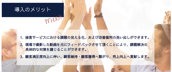 接客担当者(被写体となる方)及び、現場管理者、経営者の皆さんにとって、客観的に現場の様子を動画で切り抜くことができ、現場の現状を正確に把握することができます。その後の施策の立案へ役立てることができます。