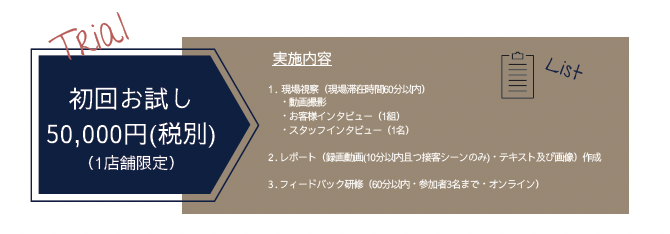 店舗視察(動画撮影を含む)によるサービス現場の課題調査を行い、その調査レポートを元に改善箇所について共有させて頂きます。サービス現場の現状を社内共有し、課題を浮き彫りにすることで、今後の実施施策の策定に役立てます。