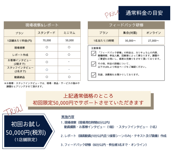 - 顧客視点で、店舗のリアルな印象や満足度をお伝えします。また、専門家視点で、店舗の課題や改善アイデアについてもお伝えします。