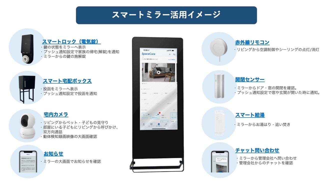 また、今般追加取得した全戸に、ミラーフィット株式会社(本社:東京都渋谷区、代表取締役:黄皓)の提供する次世代型スマートミラー「MIRROR FIT.(ミラーフィット)」を導入しました。これにより、自宅に居ながら、24時間いつでも簡単にプロが監修した本格的なトレーニングプログラムを楽しめるほか、各設備の遠隔操作やトラブル時の物件管理会社によるサポート対応等も「MIRROR FIT.」の画面を通じて利用することが可能となります。