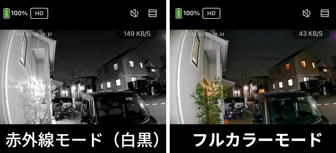 暗闇でもフルカラーで映せるので、不審者や不審な車の特定に役立ちます。