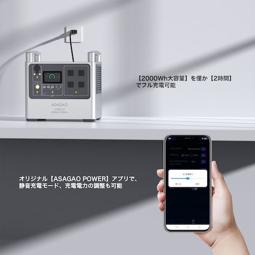 AS2000-JP専用スマホアプリ「ASAGAO POWER」でAS2000-JPに接続すると、キャンピングカーやフードトラックなどで、離れた場所からでもAS2000-JPの遠隔操作ができます。「ASAGAO POWER」で残量確認や、LEDライトのON/OFF、静音充電モード設定、AC出力定格電圧(100V/110V/120V)の切替え、AC充電入力の設定など、より詳細な設定を行うことが可能です。