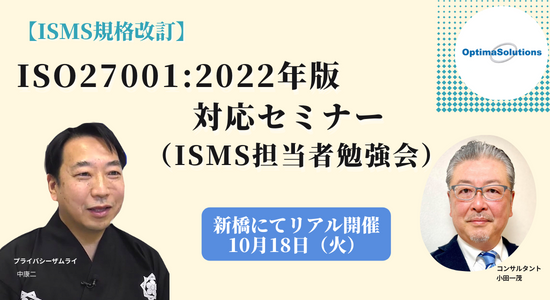 情報セキュリティ専門会社のオプティマ・ソリューションズが、ISMS規格改訂にともない「ISO27001:2022年版対応セミナー」を10月18日・新橋にてリアル開催いたします。
