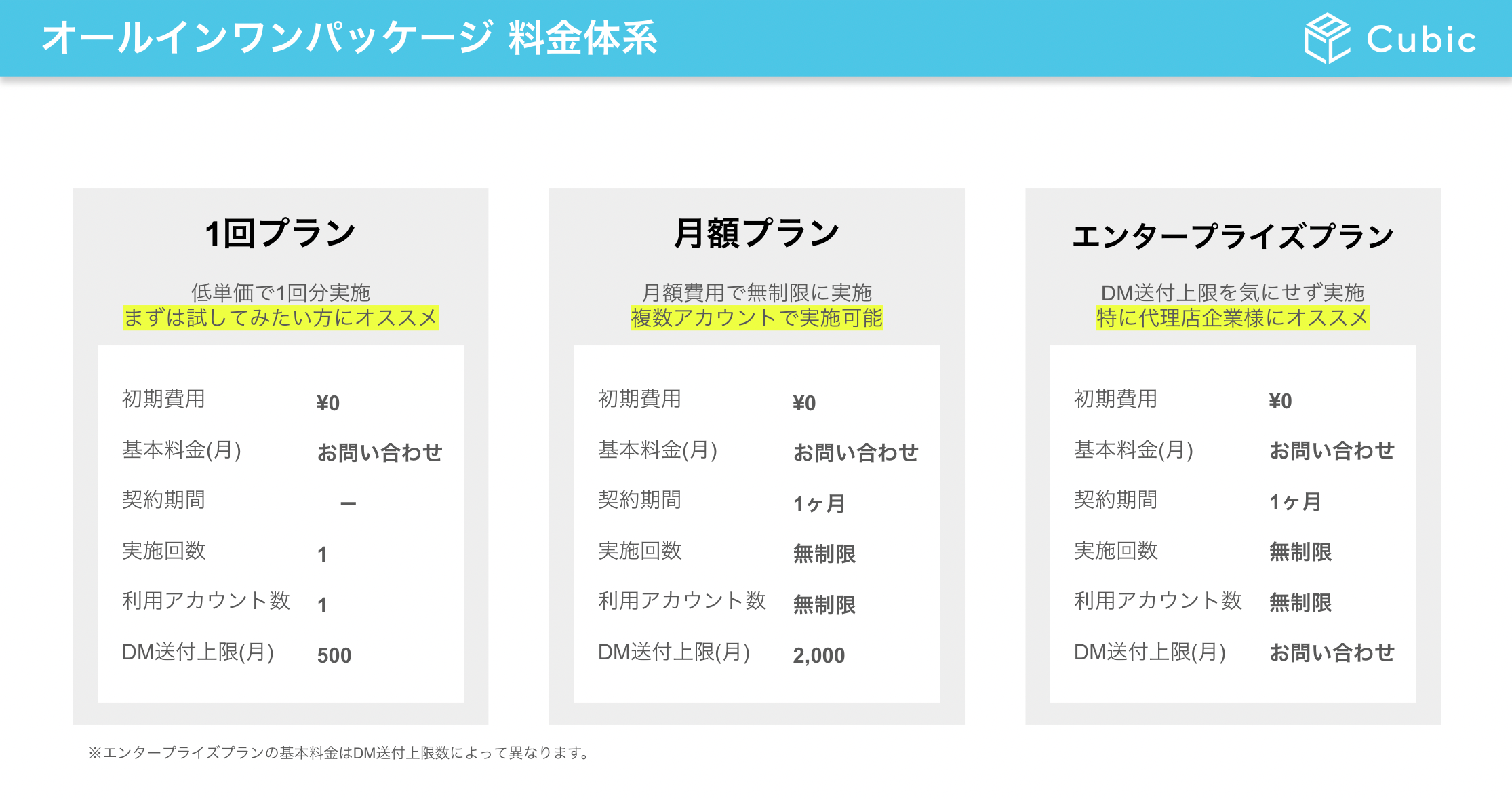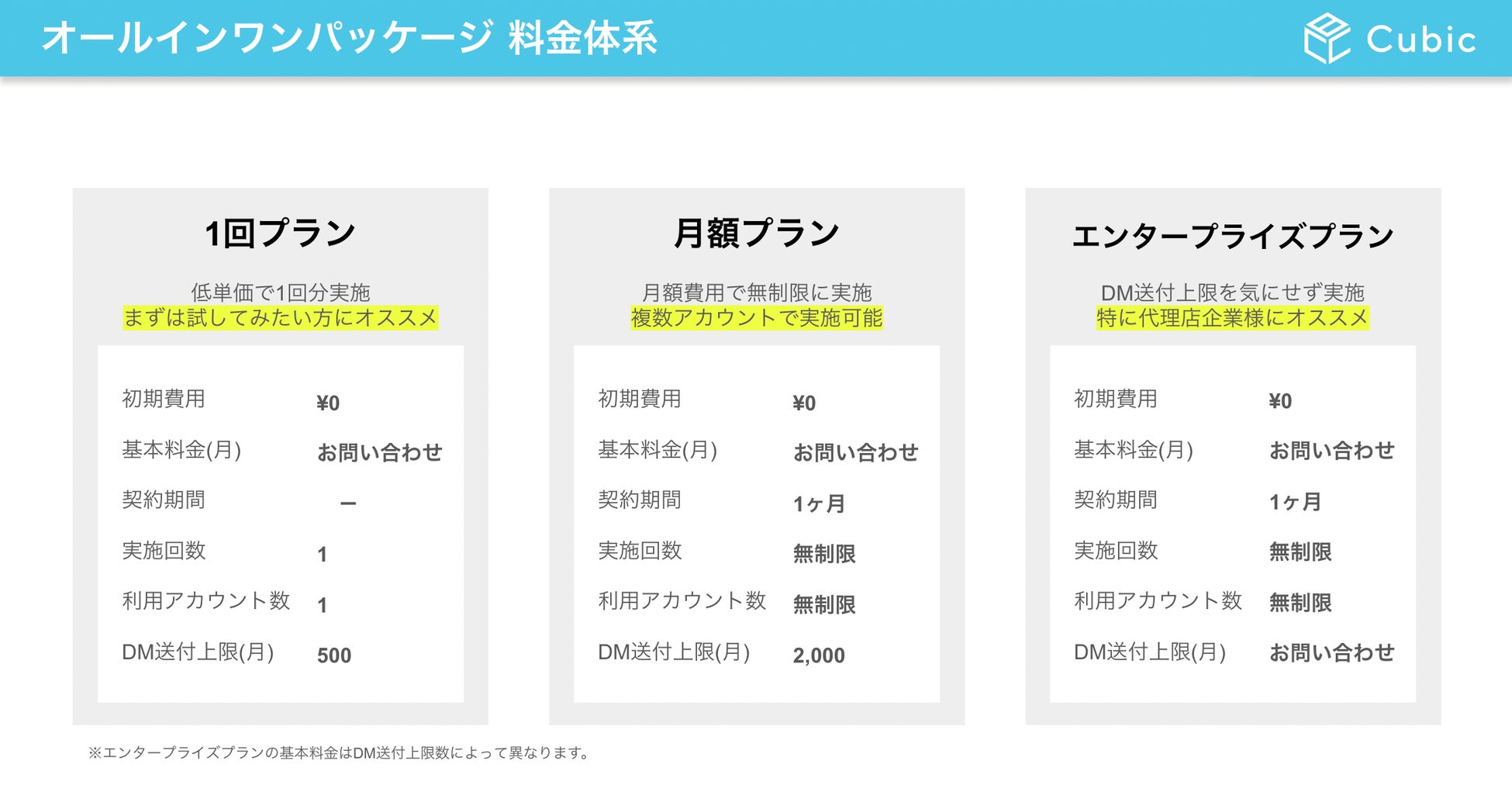 「オールインワンパッケージ」では、1回プラン、月額プランの2種類を提供します。月額プランは固定金額でキャンペーンが無制限に実施可能です。実施アカウント数も無制限です。*DM送付数に上限がございます。