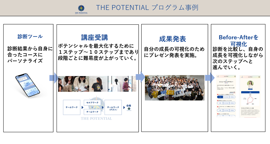 ポテンシャルコース、ビジネスコース、デジタルコース、ヘルスケアコースに分かれ、診断ツールを元に女性を確実にキャリアアップへと導くためにパーソナライズして学びを最適化