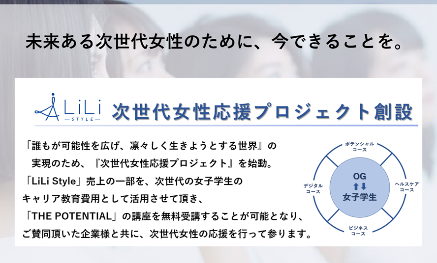 福利厚生サービス「LiLi Style」売上の一部を、『次世代女性応援プロジェクト』として女子学生のキャリア教育費用に充てさせて頂くことで、ご賛同頂いた企業様と共に、次世代女性の応援を行っていき、『誰もが可能性を広げ、凛々しく生きようとする世界』を目指して参ります。