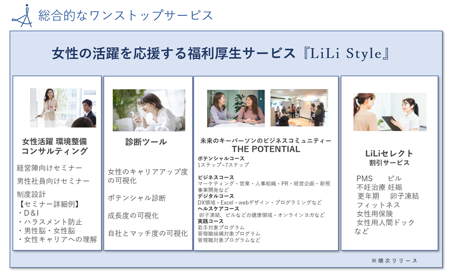 女性のポテンシャルを最大化する人材開発カンパニーであるLiLi株式会社(所在地:東京都港区、代表取締役:廣岡絵美)は新事業となる企業向け福利厚生サービス「LiLi Style」をリリースします。