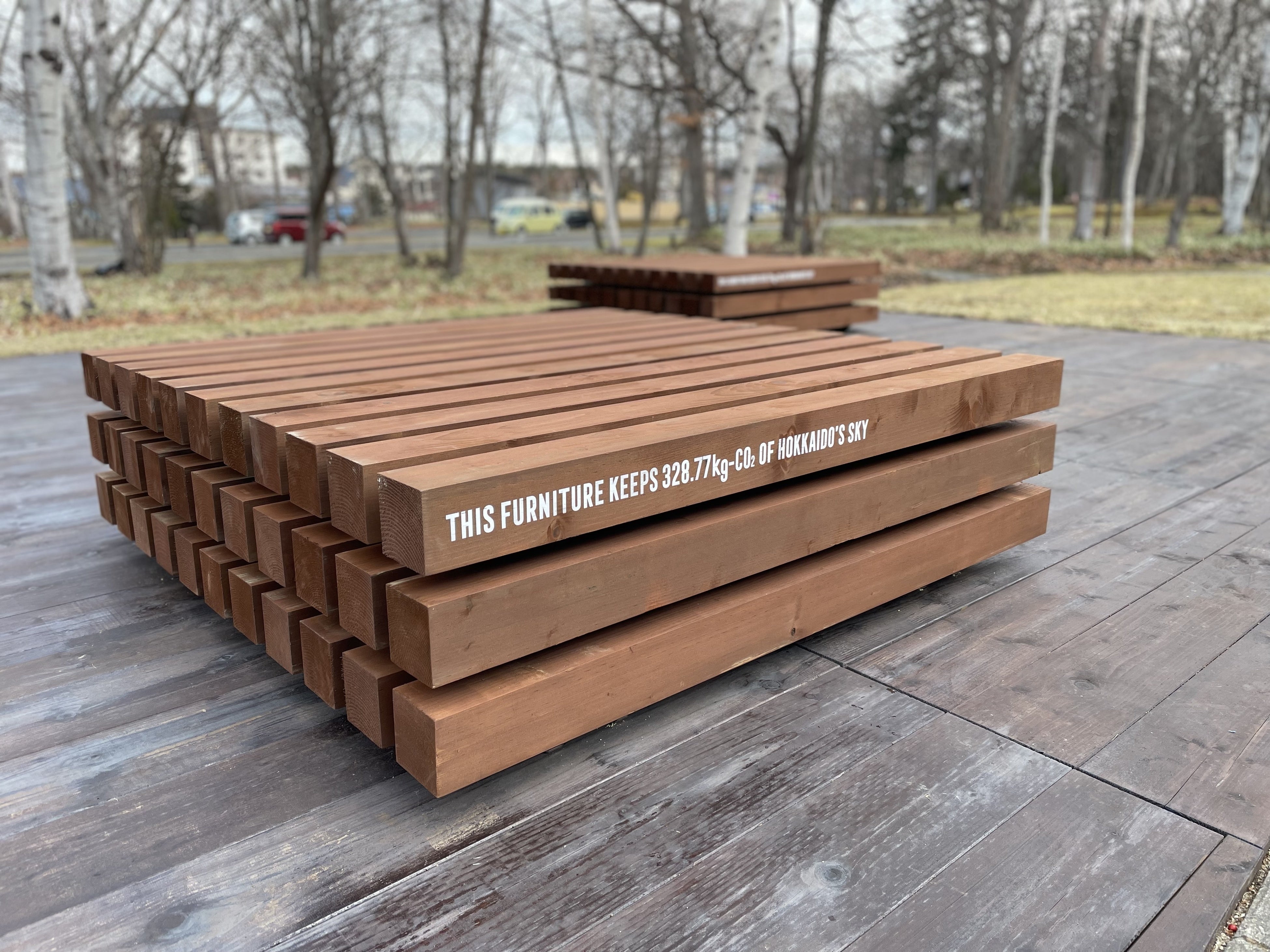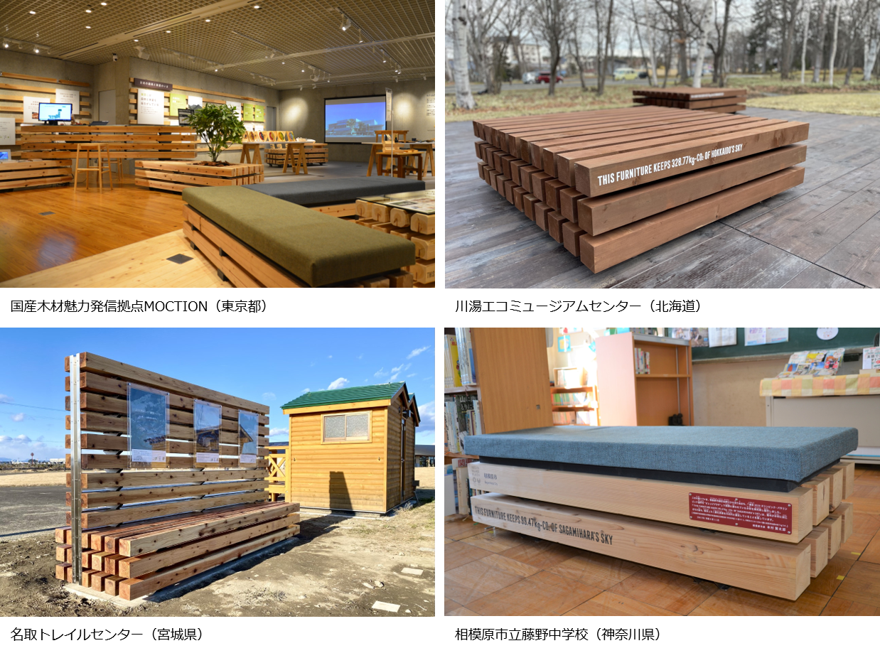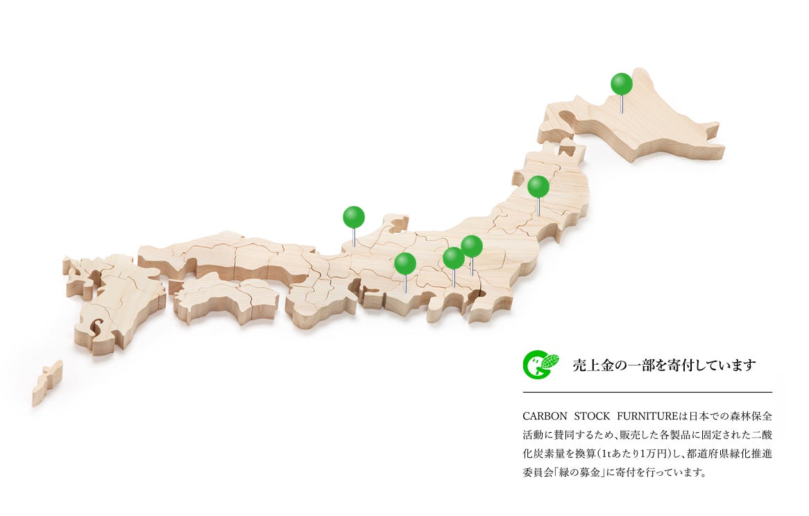 この3つのアイデンティティを持つCARBON STOCK FURNITUREを通して環境保全への取り組みを推進し、2022年3月現在までに日本全国各地に導入、CO2総固定量は19tを超える見込みです。(2022年3月現在)