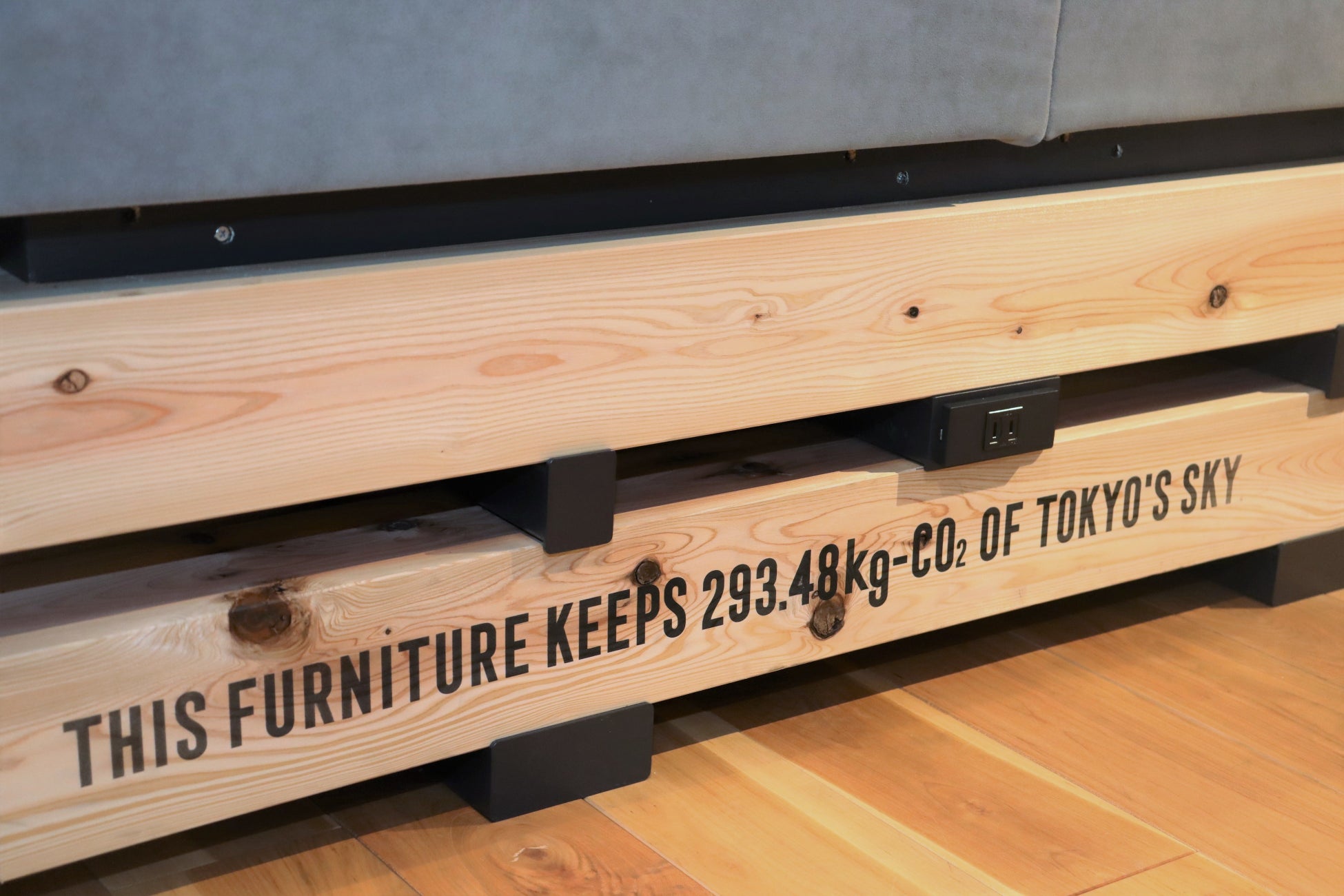 「都市を森林の貯蔵庫に還す」ことをコンセプトに、大気中のCO2を固定させた木材をできるだけ多く使用することを前提に設計。より多くのCO2を家具として貯蔵できるようにし、固定したCO2量を家具に直接印字し可視化しています。また、使用する木材は加工を最小限にすることで、木材を再利用し易いよう配慮しております。ソファー、ローテーブル、カウンター、デスクといった基本プロダクトから、導入先の空間に合わせた特注の提案も可能です。