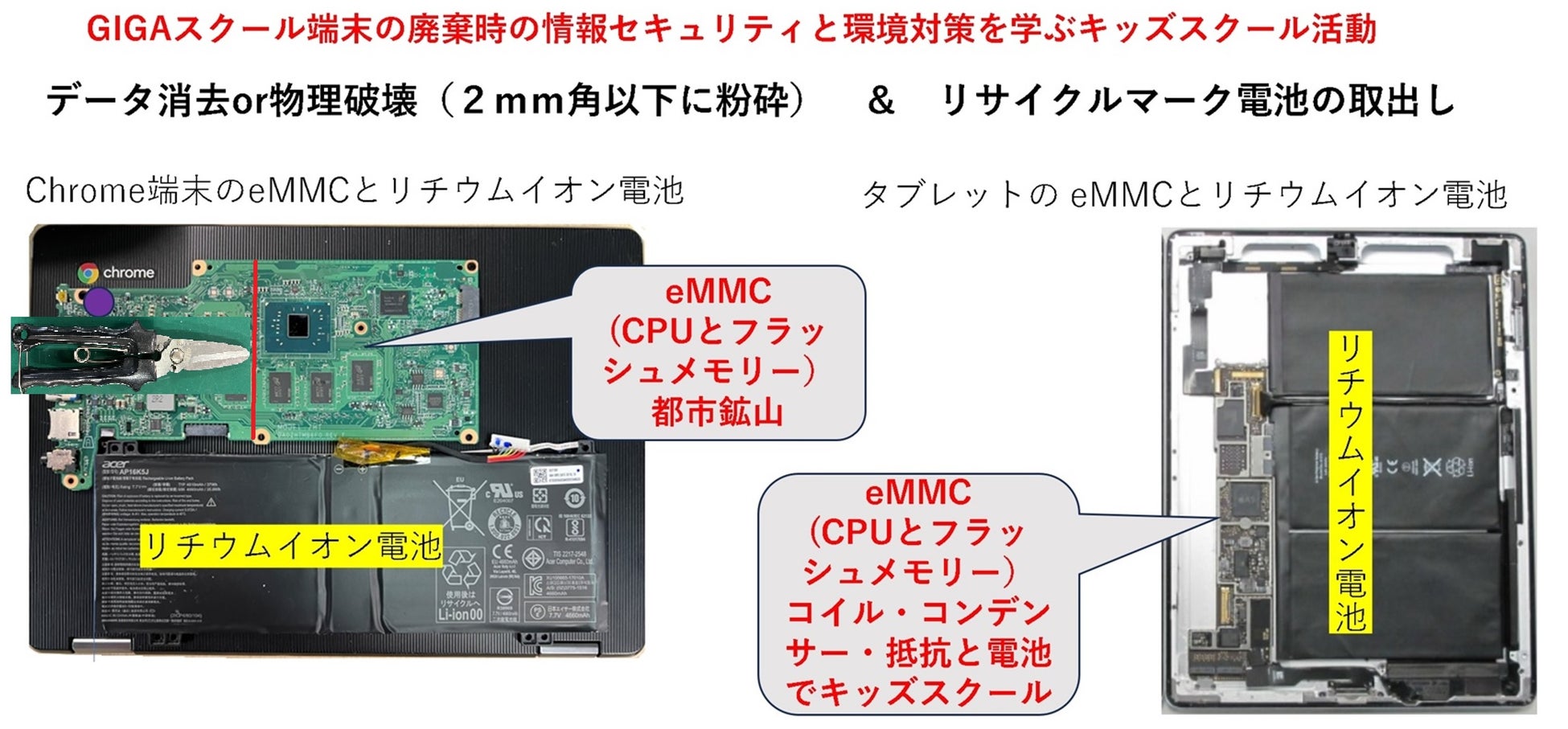 GIGAスクール構想により全国の小中学校に配布された約950万台のタブレット端末が、2025年度以降、耐用年数の終了に伴い大量更新を迎えます。これらの使用済み端末には個人情報が含まれるeMMC(データ残存部)やリチウムイオン電池が搭載されており、適切なデータ消去と資源回収が喫緊の課題となっています。