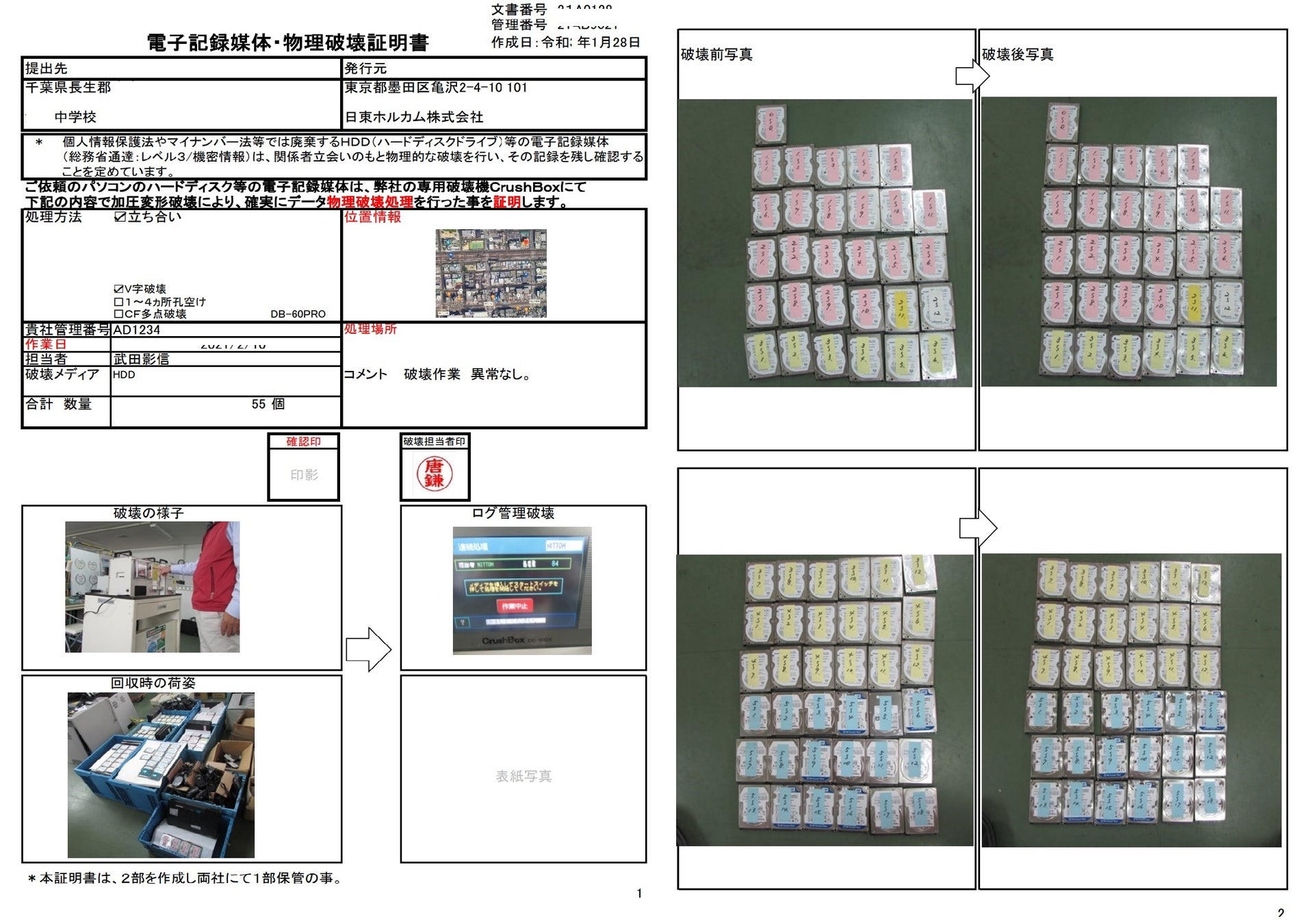 日東ホルカムでは、破壊作業の動画撮影や破壊証明書の発行サービスも提供しており、作業の透明性と信頼性を確保できます。