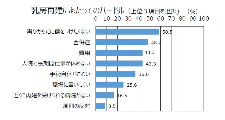 乳房再建を考えるにあたってのハードルについて複数回答で比較すると、「再びからだを傷つけたくない」が最も高く6割近くの人があげています。次に高くあげられたのは「合併症」で5割近くの人があげ、「費用」、「入院で長期間仕事を休めない」は4割以上の人があげています。この4項目が上位に挙げられているのは2021年、2022年と同じ傾向にあります。