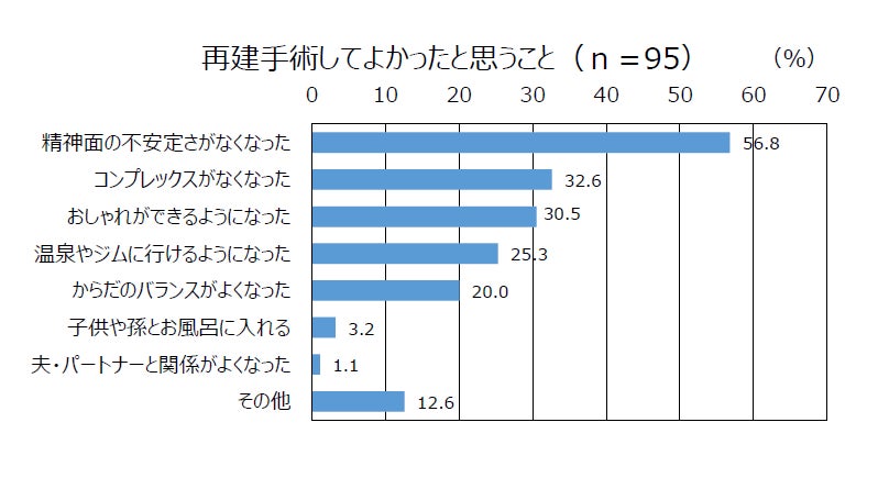再建手術をしてよかったと思うことは、「精神面の不安定さがなくなった」が最も高く56.8%で、2022年(44.7%)より多くの人があげています。次に高いのは「コンプレックスがなくなった」、「おしゃれができるようになった」で3割以上の人があげています。