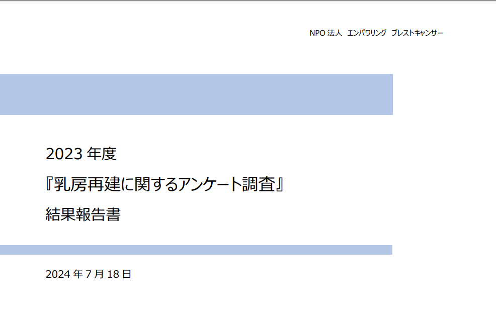NPO法人 エンパワリング ブレストキャンサー(所在地:東京都目黒区、理事長:真水 美佳、以下E-BeC)は2023年度『乳房再建に関するアンケート調査』結果報告書を公開しました。この報告書は「乳房再建手術」に対する社会的認知や理解の向上を図ることを目的に、「乳房再建手術」の経験者を含む乳がん患者さんたちの意識を把握するため2013年から毎年実施しているもので、今回で11回目となります。今年もすでに再建を終えてた人からこれから始まる治療とともに乳房再建を検討している人まで、多様な乳がん患者さんの声が集まりました。ダウンロード請求はこちらから。