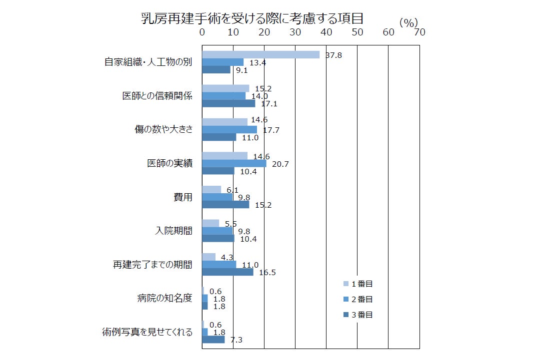 乳房再建手術を受けるときに考慮する項目で、一番目に重要なこととしてあげられたのは2022年と同じように「自家組織・人工物の別」です。2番目に重要なことは「医師の実績」が高く、2割の人が挙げています。3番目に重要なことで高いのは「医師との信頼関係」、「再建までの期間」、「費用」でした。