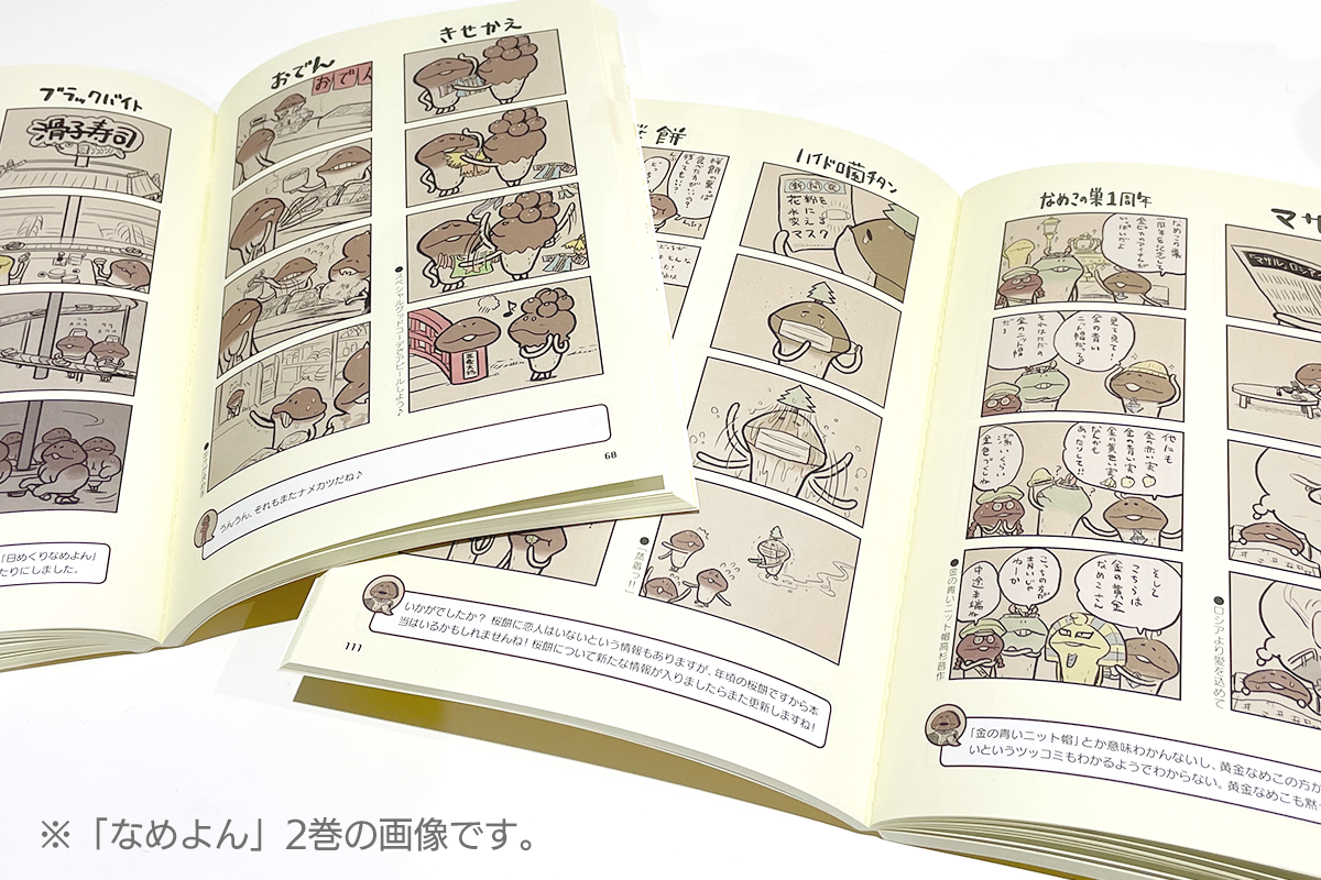 スマホアプリ「なめこ栽培キット」公式サイトで連載中の4コマ漫画「なめよん」を単行本にしたい!2019年「なめよん書籍化プロジェクト」の大成功から約5年の時を経て、なめよん③巻の刊行、さらに絶版となっているなめよん①巻&②巻の復刊を目指して再びプロジェクトを始動します!!