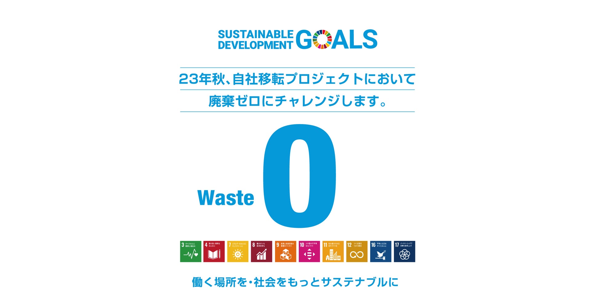 2020年にサステナブルプロジェクトを発足し、2021年「はたらく場所を・社会を・もっとサステナブルに」とした、サステナビリティ宣言を行いました。限りある資源を最大限循環させ価値を目減りさせない「循環型オフィス=サステナブルなオフィス」の実現に向け取組みを始め、2022年にはオフィス構築工事で発生していた廃棄物をゼロにすることを目指し、これまで81%だったリサイクル率を84%にまで引き上げました。そして今年2023年の自社移転プロジェクトでは「廃棄ゼロ」の追及により環境や社会に貢献するサステナブルなオフィスづくりにチャレンジいたしました。