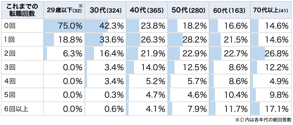 ∟医師の転職回数を年齢別に比較したところ、30代で「0回」の医師の割合が大きく減少