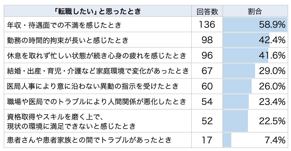 ∟転職支援サービスを提供するメディウェルの会員医師である点を踏まえても、多くの医師が転職を経験している結果に