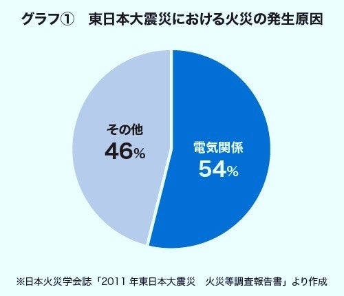 東日本大震災の火災発生原因を調べてみると、半数以上が電気関係の出火によるものでした(グラフ①)。