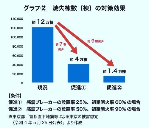 東京都の調査によると、初期消火率の向上と併せて感震ブレーカーが25%普及すると焼失棟数が約7 割、50%普及すると約9 割も減少する試算結果が出ています(グラフ②)。東京都は、関東大震災から100 年目に当たる2023年、木造住宅が密集している地域を対象に感震ブレーカーを無償配布しました。