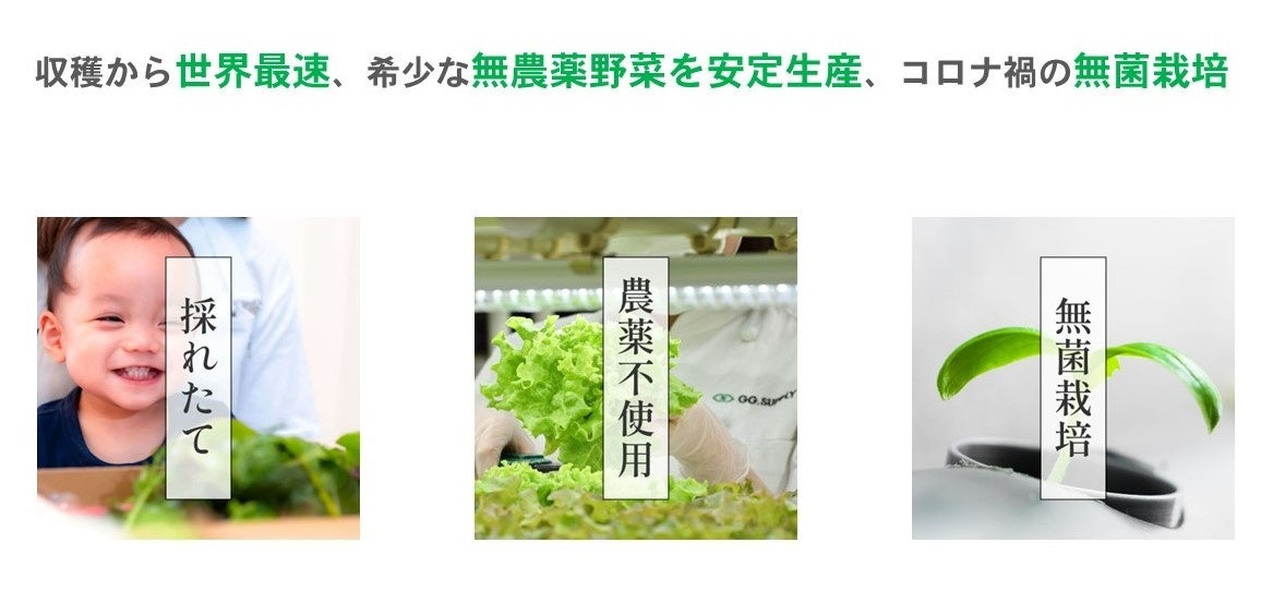 完全に密閉された店内にて水耕栽培を行うことで、「収穫から30分以内、無菌栽培、・農薬不使用」野菜をご自宅までデリバリーすることを可能にしました。本年度より全国展開を予定しております。
