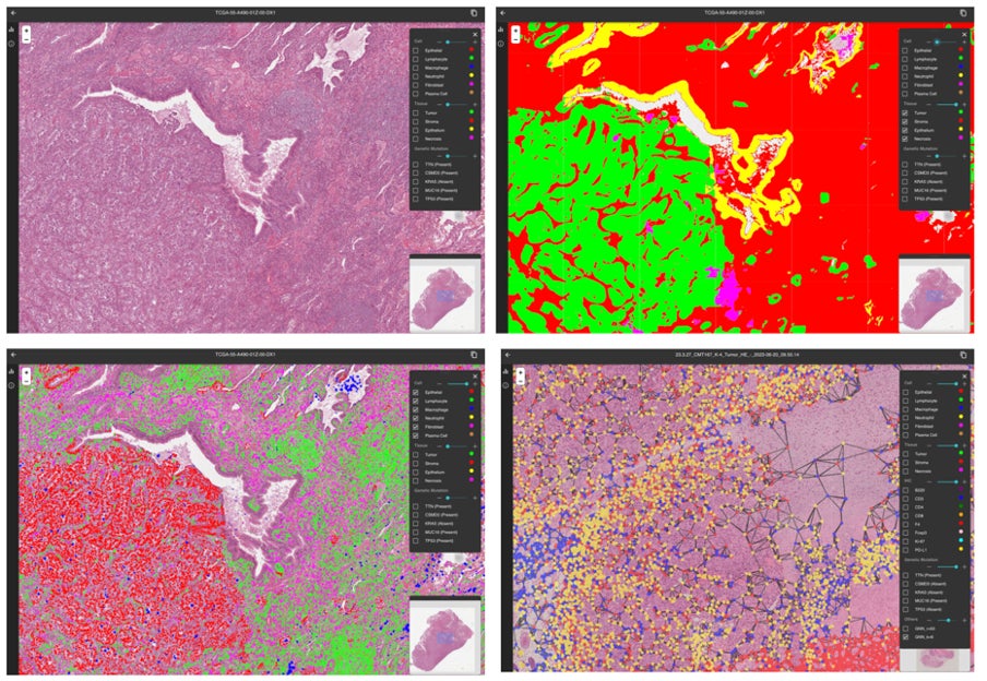 Examples of DeepPathFinder™ analysis (top left: original H&E image, top right: tissue area detection, bottom left: cell detection, bottom right: analysis of cell-cell interaction by graph network)