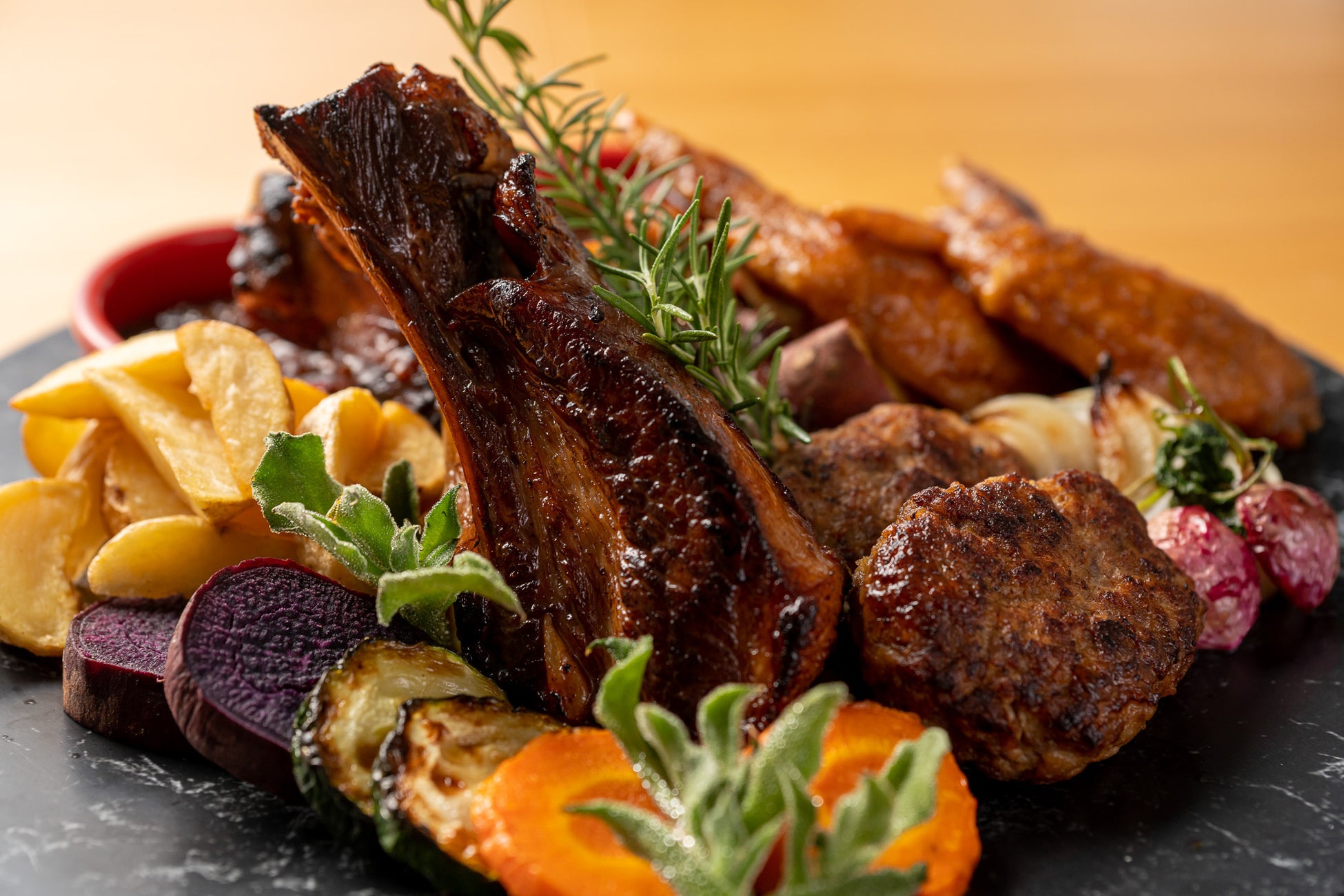 三州豚のスペアリブ、三河鶏のチキンウィング、ハンバーグ、グリル野菜