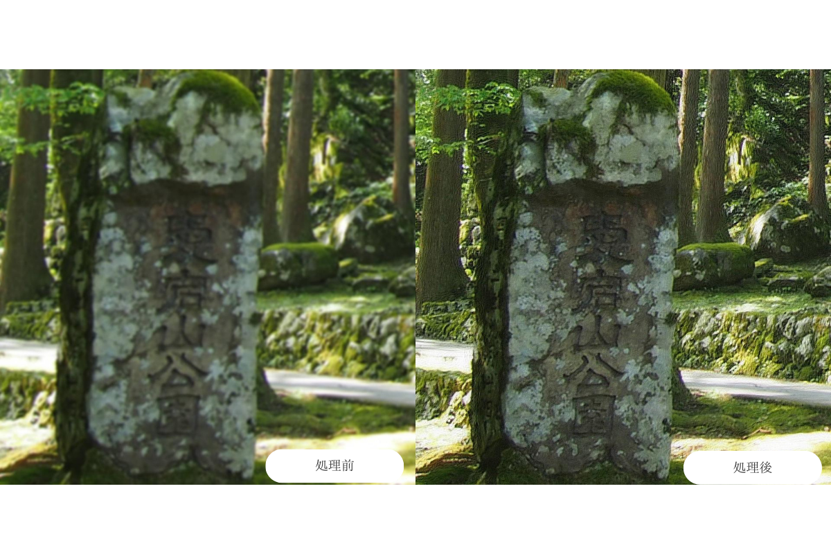 ※画像鮮鋭化イメージ(デコンボリューションによりボケの最大2倍の改善、超解像により最大8倍の画素補間が期待できます。)