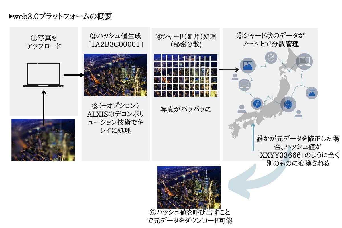 我々が起用したweb3.0の秘密分散技術は、特定の事業者にデータを預けるのではなく、世界中に分散したコンピューター1台1台にデータを保存できる、全く新しいデータ保存の仕組みです。仮に、もし全世界のパソコンを秘密分散技術に接続することができれば、特定の事業者に依存せず、即座に大量のデータを扱うことができます。