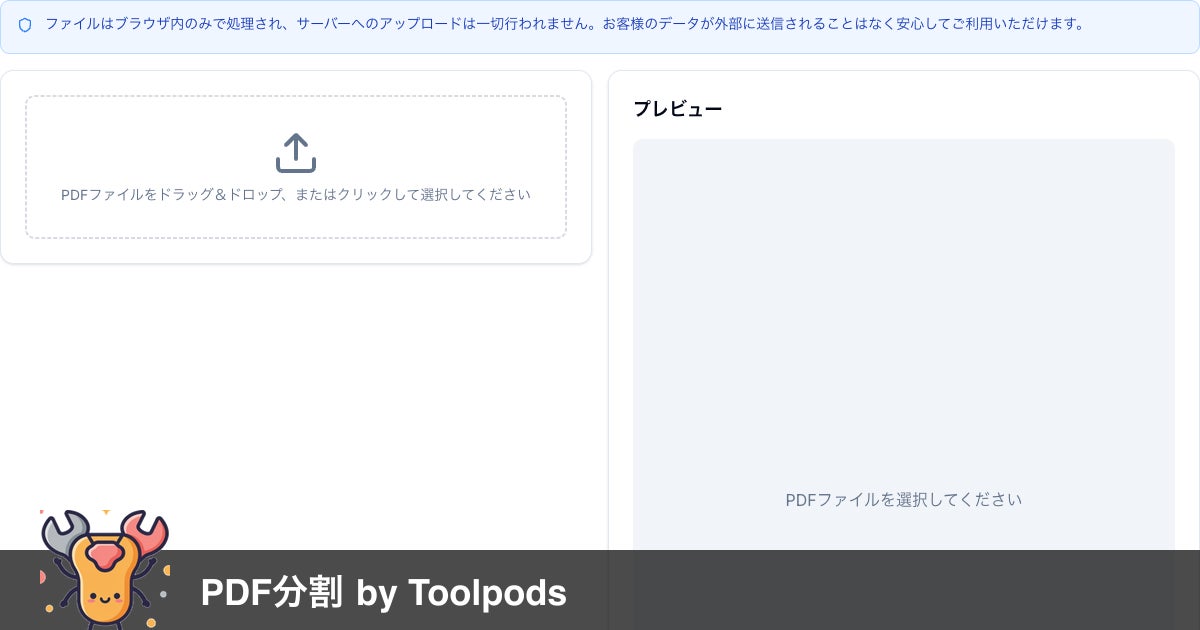 『PDF分割 by Toolpods』は、これらの懸念を払拭するため、ブラウザ内で完全に動作します。ユーザーがアップロードしたPDFファイルが外部サーバーに一切送信されないため、重要書類や機密データを安心して取り扱うことが可能です。