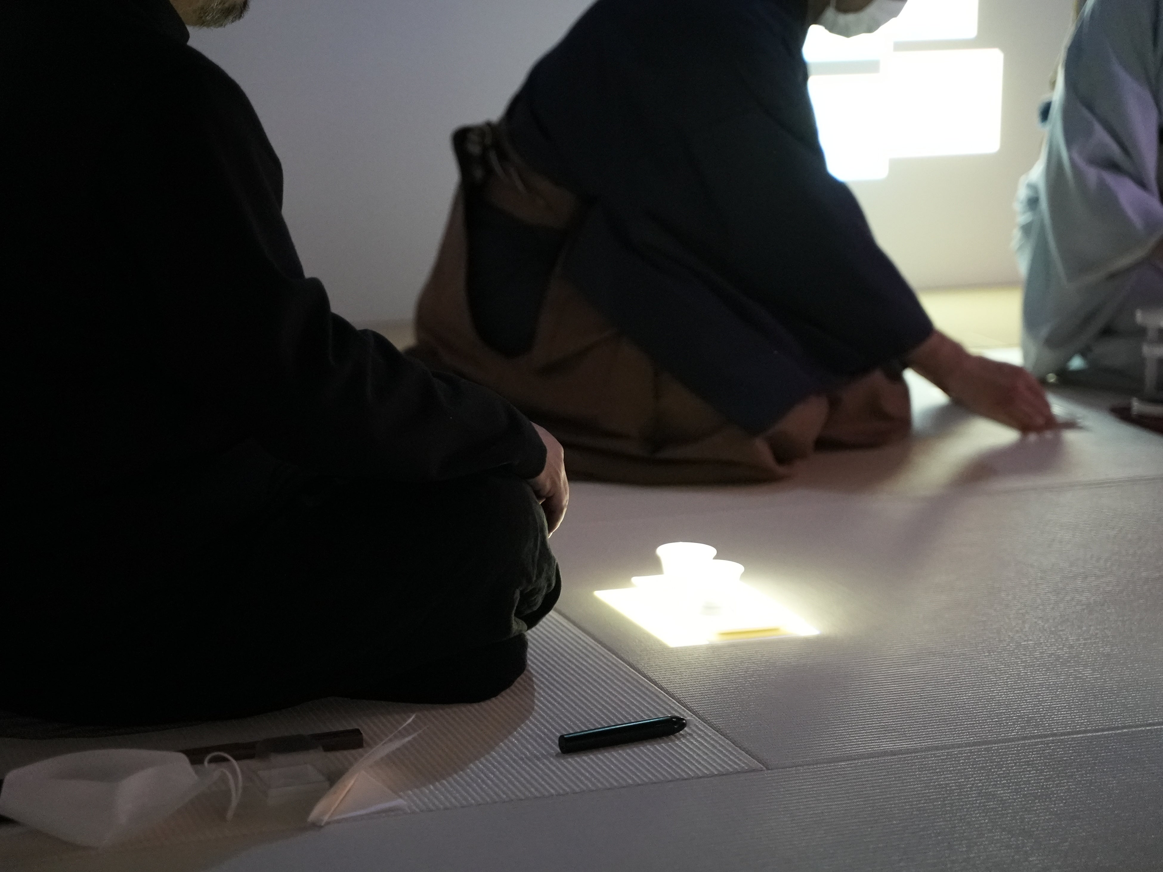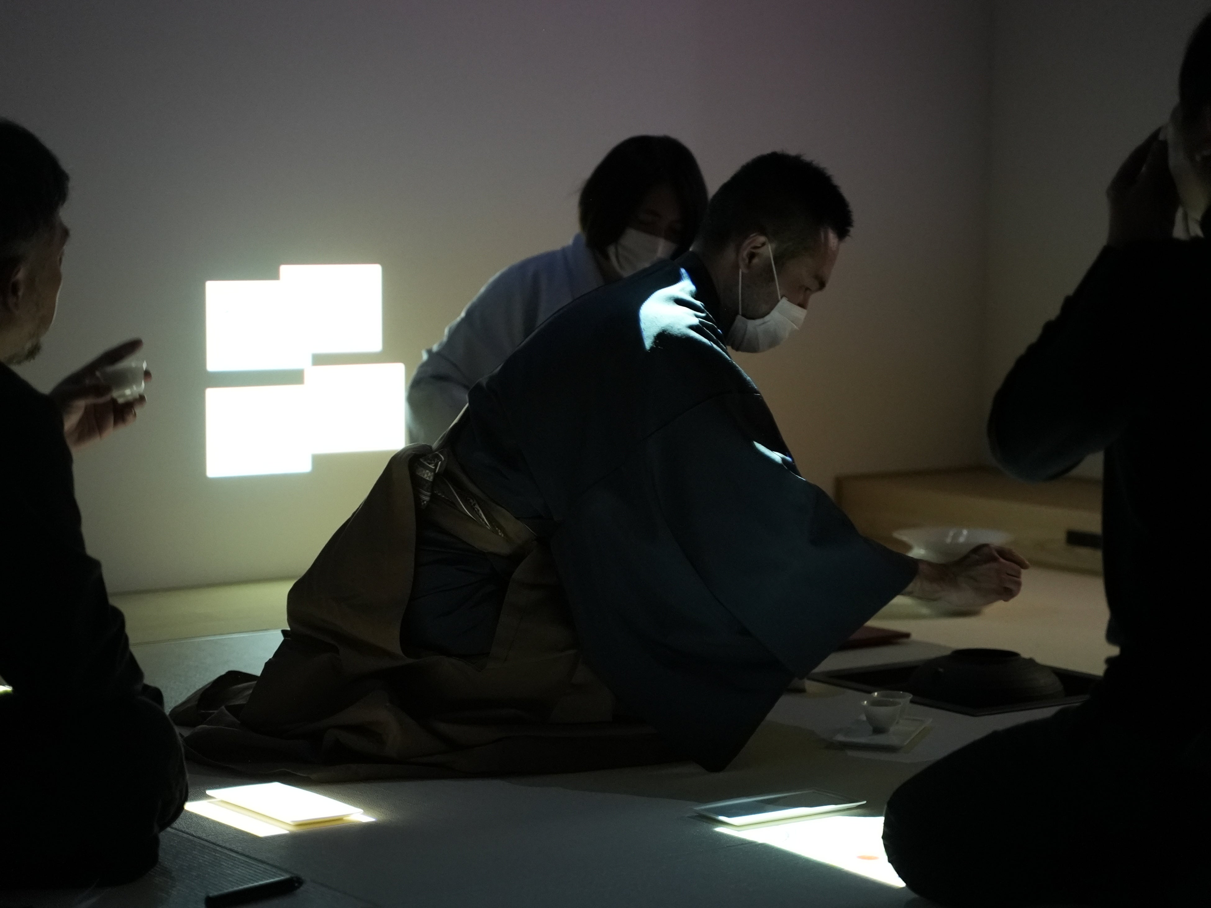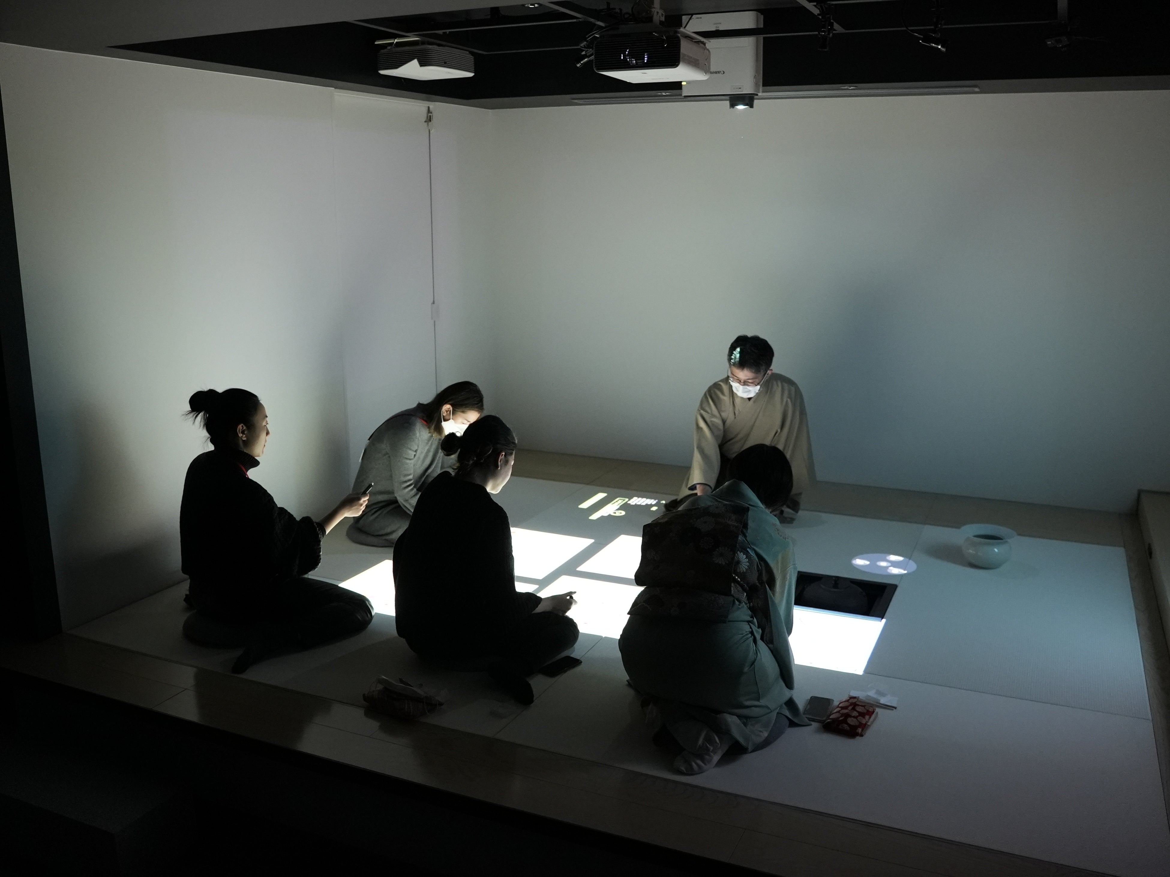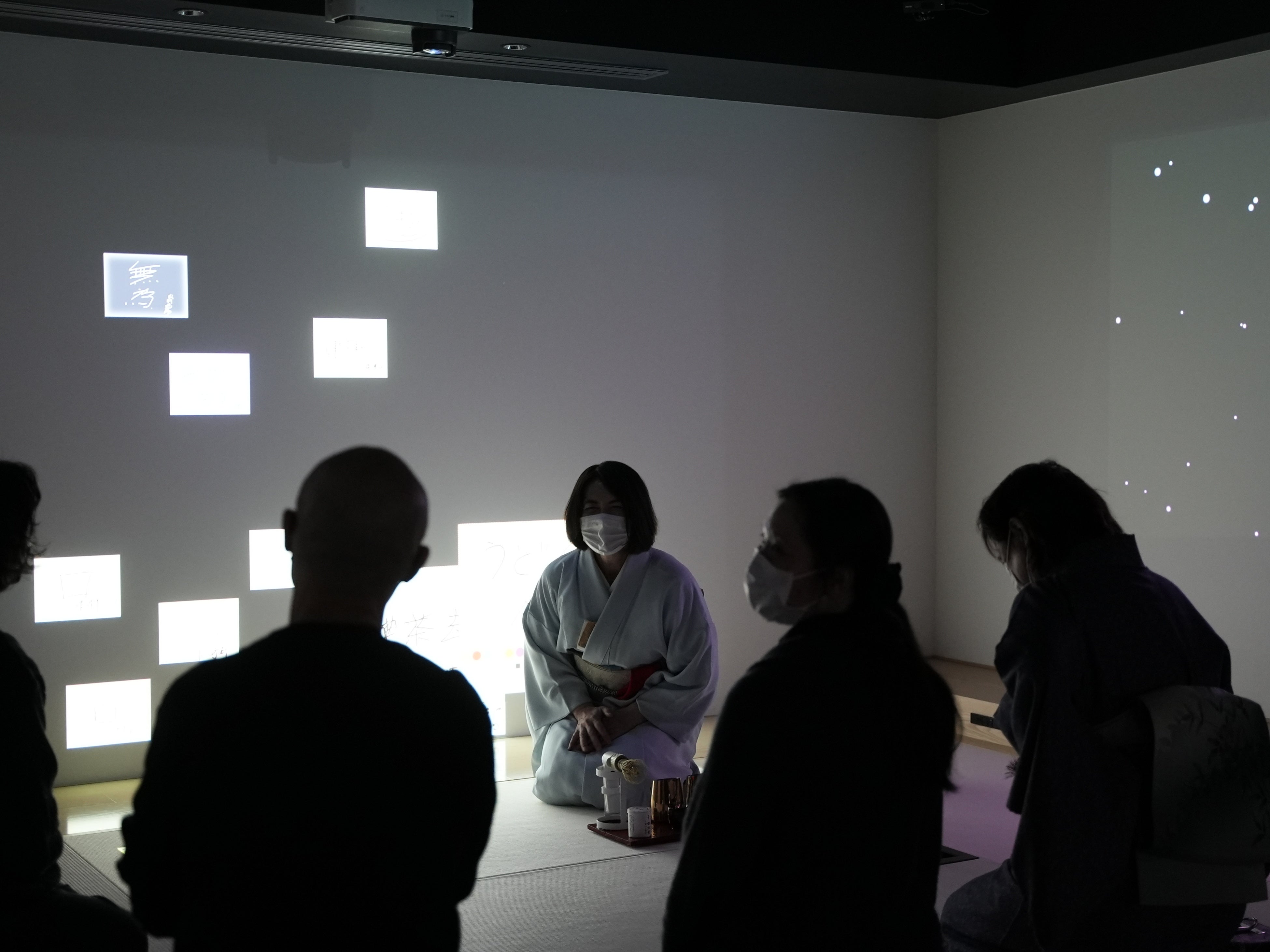 そして第二部は「サイバー茶歌舞伎」。3種類の抹茶の味を当てるゲームは、参加者が畳のモニターに自ら専用のペンで文字や絵を描きながら進行。自分の書いた文字を茶室の壁に飛ばしながらのデジタル&インタラクティブな新しい茶会を楽しみました。