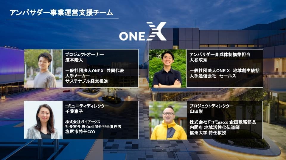 本事業の運営は、数多くのイベントやコミュニティ運営を行い、行政・地域企業支援を中心とした実績を多数有する一般社団法人ONE Xが受託し、以下メンバーにてチームを組み支援してまいります。