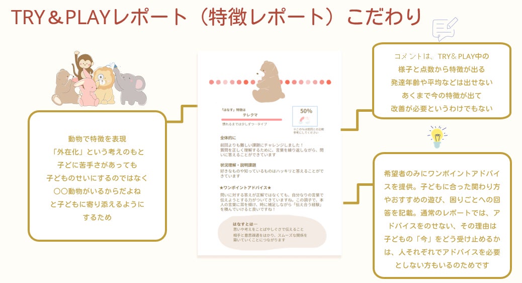 レポートにはかわいらしい動物のキャラクターや親しみやすいコメントが添えられ、専門的な内容であっても直感的に理解しやすく、前向きにこどもの個性を捉えるきっかけになります。